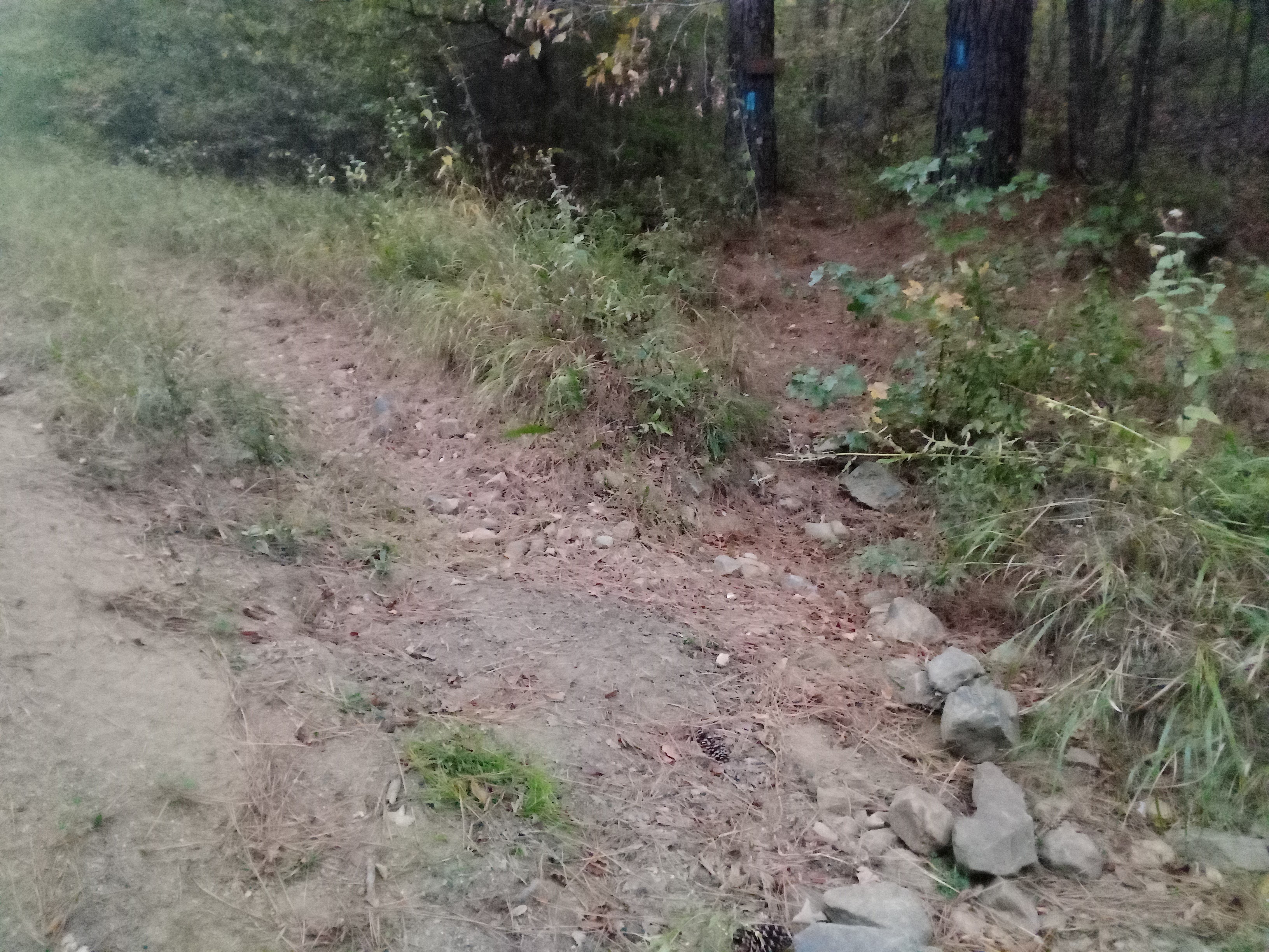 • Late afternoon and early evening seemed to be traversing former forest roads (the trail corridor was wide enough, that seems the best explanation), connected by sections of single track and current forest road. I like the variety. The exit from the forest roads tends to be well marked which I appreciate since, lacking a GPX track, it would be easy to overshoot. While only a little overgrown, there are sections which seem to be returning to their natural state. It’s a pity because I get the sense that some of the single track had really nice rock work at one point.