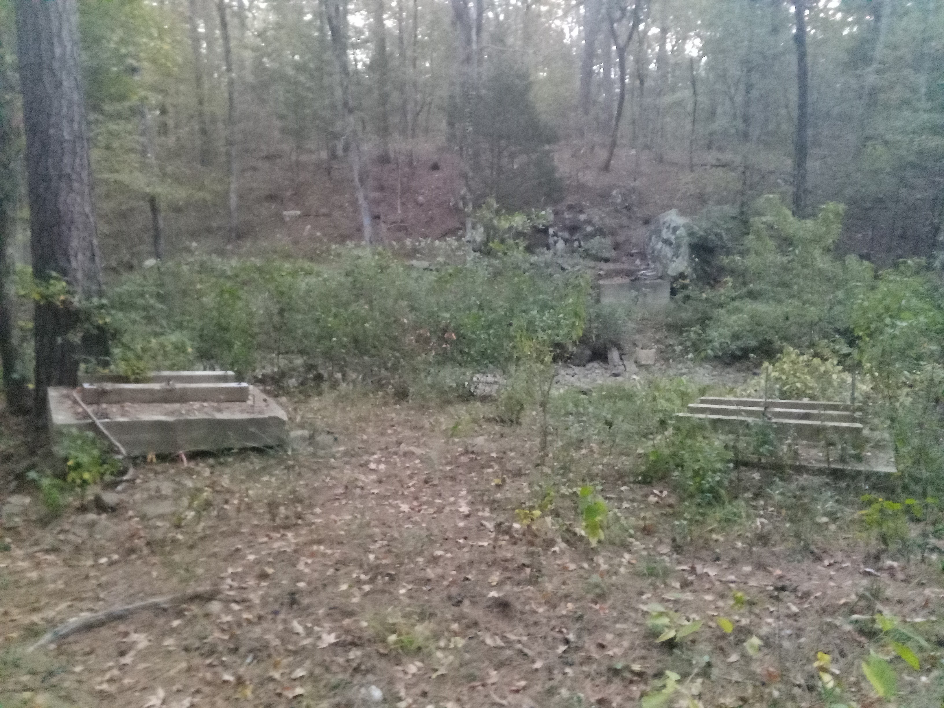 • Ouachita Pinnacle is an industrial site with two radio towers and a gravesite with a wood headboard tacked to a tree. The only view is from where the power or phone lines come up through a cut in the trees.