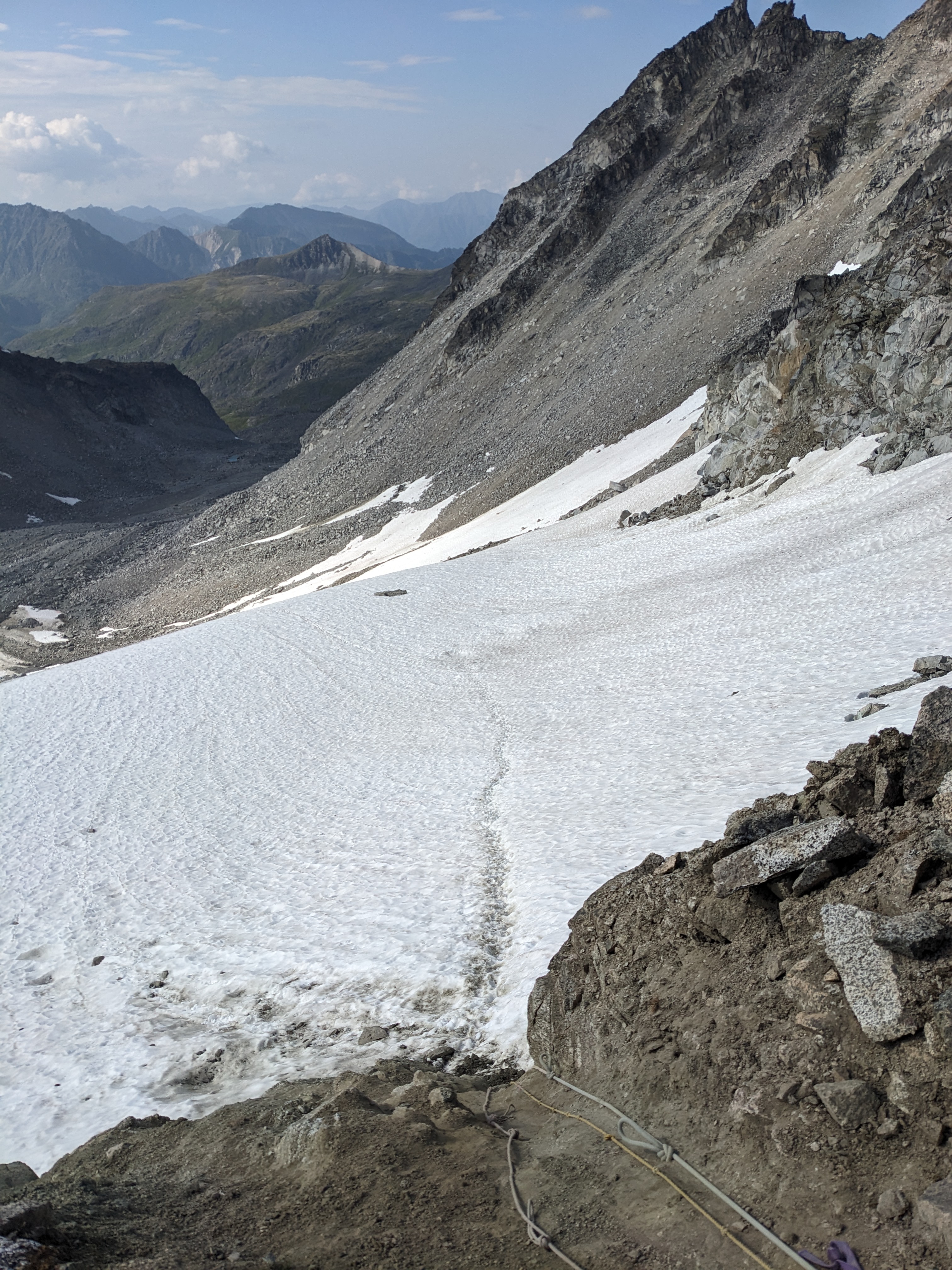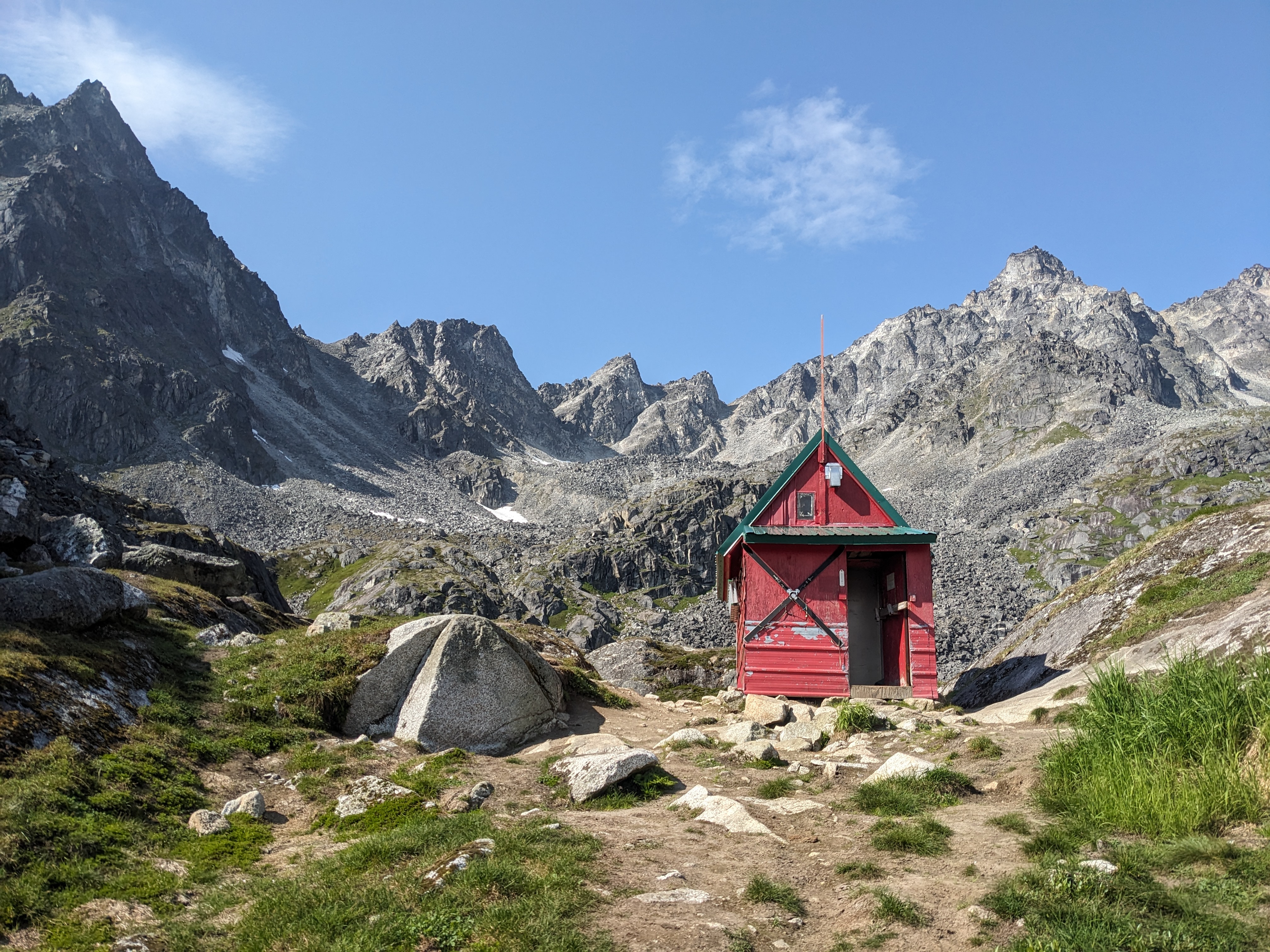 Those questions wouldn’t be raised until after the Gold Mint Hut, towards which, the Gold Mint trail now began to climb. I passed a red faced, sweaty fellow in a cowboy hat and holster, belly sagging over his belt as he sat on grass with his legs over a mud puddle. Children played around him in a small clearing. It was hard not to judge him as in over his head. A short while later, I stopped to get beta from a lean, tan climber who’d casually stepped aside to let me pass. He’d been out for a few days, summited a nearby peak in the morning and was heading out for a town day. He’d referred to the peak by name, assuming my familiarity with the area. I thought Montana was a state. My nervous, repeated questions about snow and trail conditions contrasted with his easy manner and must have left him with the same thoughts I’d just had about the seated man. Apparently the high snow year had left a hard snowpack and it was good that I was going over Backdoor Gap later in the day so the snowfield would be softer. It wouldn’t be a problem if I was good on my feet, he said. The way to Snowbird Hut was like this, he’d said waving his hand broadly at the steep, brushy, mountainside but without a trail. “Like this but no trail” I said. I’d just been appreciating how the social trail left just enough weakness in the bushes for my small pack to sneak through.