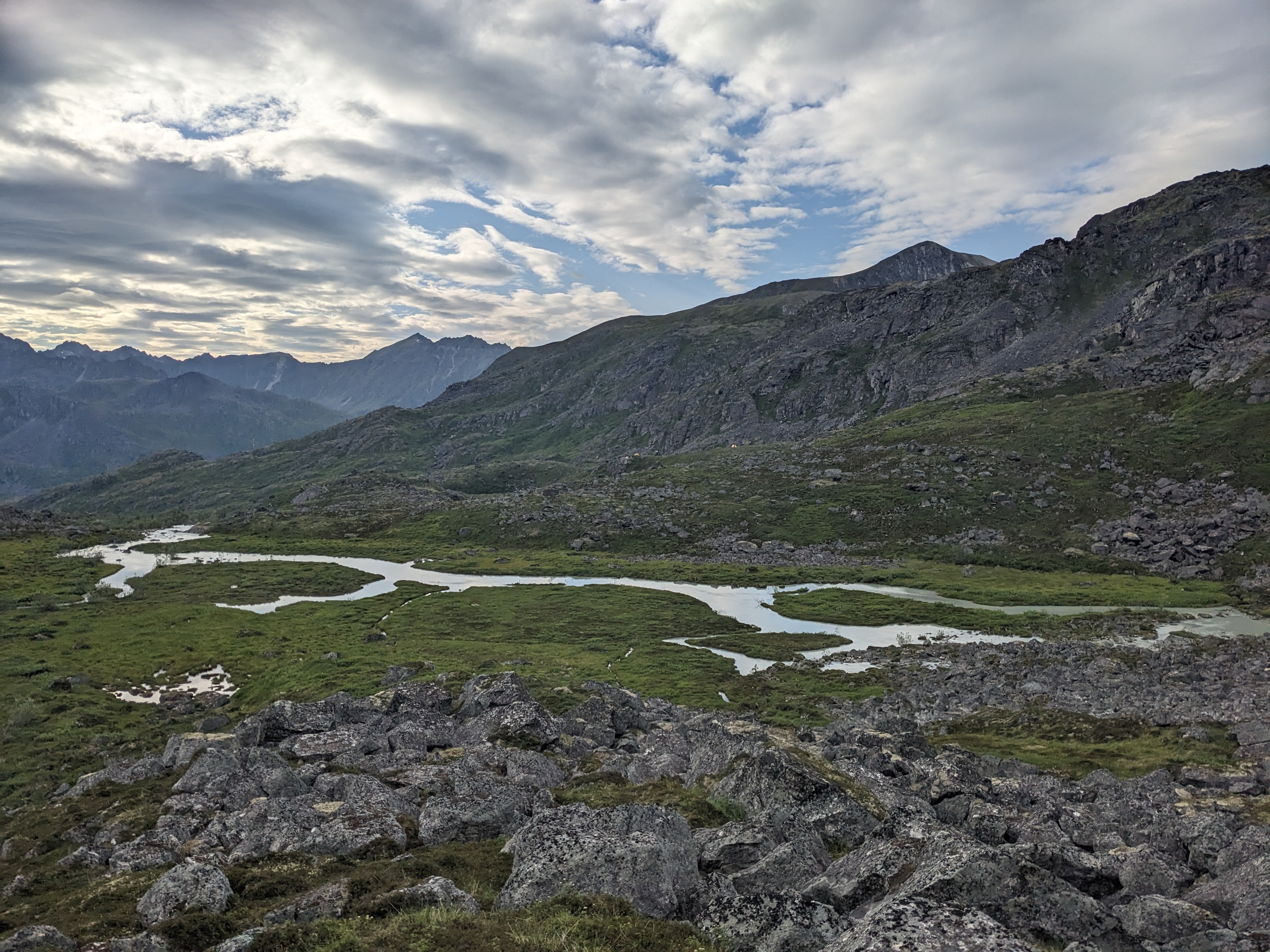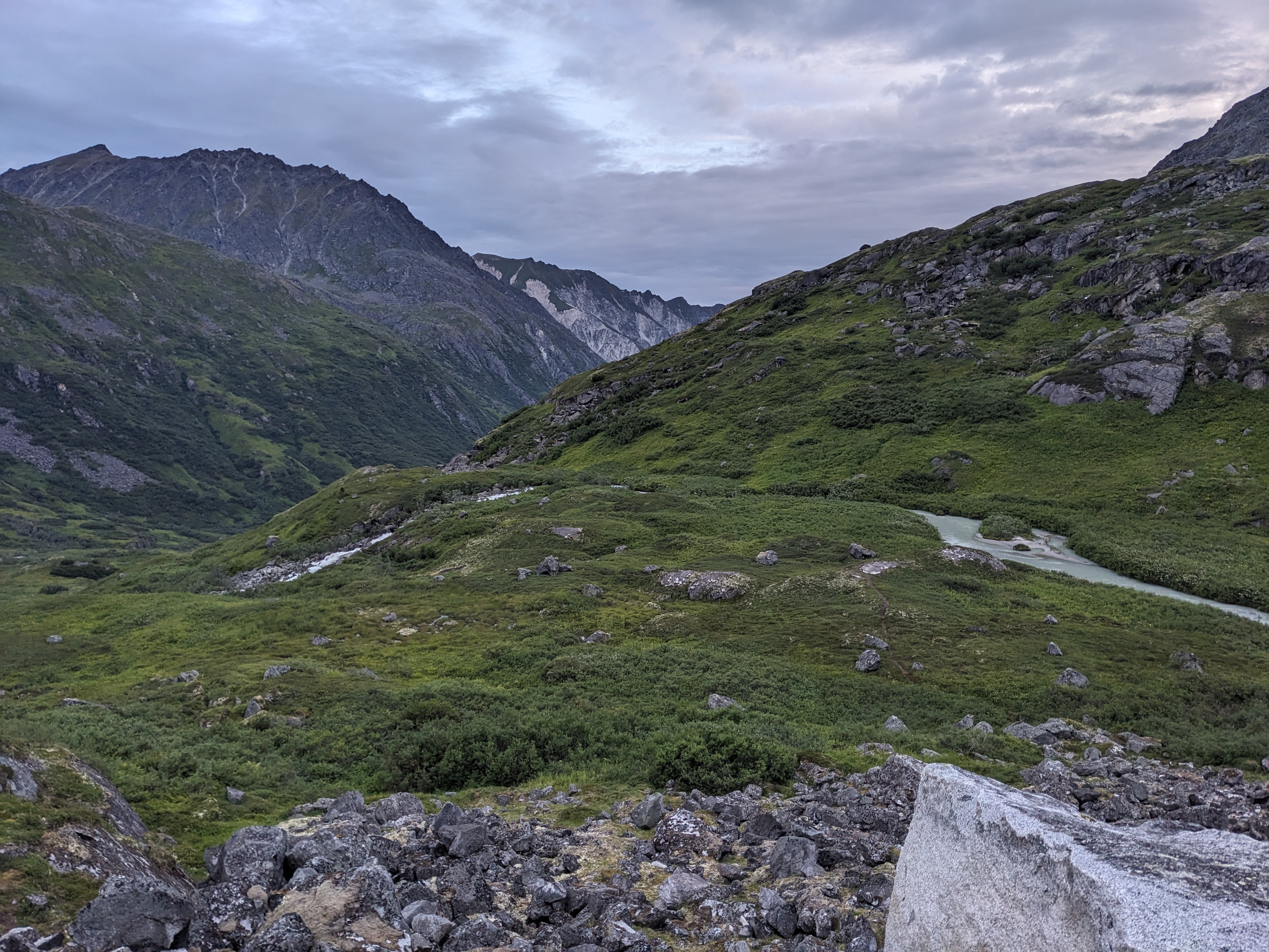 The river in the middle of the glacial valley would visit briefly with the trail at silty openings in the brush where children, dogs, and one smoker enjoyed the water. I think the trail builders forgot about the mile 2 marker, otherwise I was walking at 10min/mi after 3 miles. Eventually, the trail turned boggy, then bushy, then bouldery and back again to bushy and boggy. It became more of a “social” trail with elements of bushwhacking than a “trail” trail. Apparently my bear protocol wasn’t so good. I surprised a pair of heavily laden backpackers wallowing their way along, doing combat with small branches.