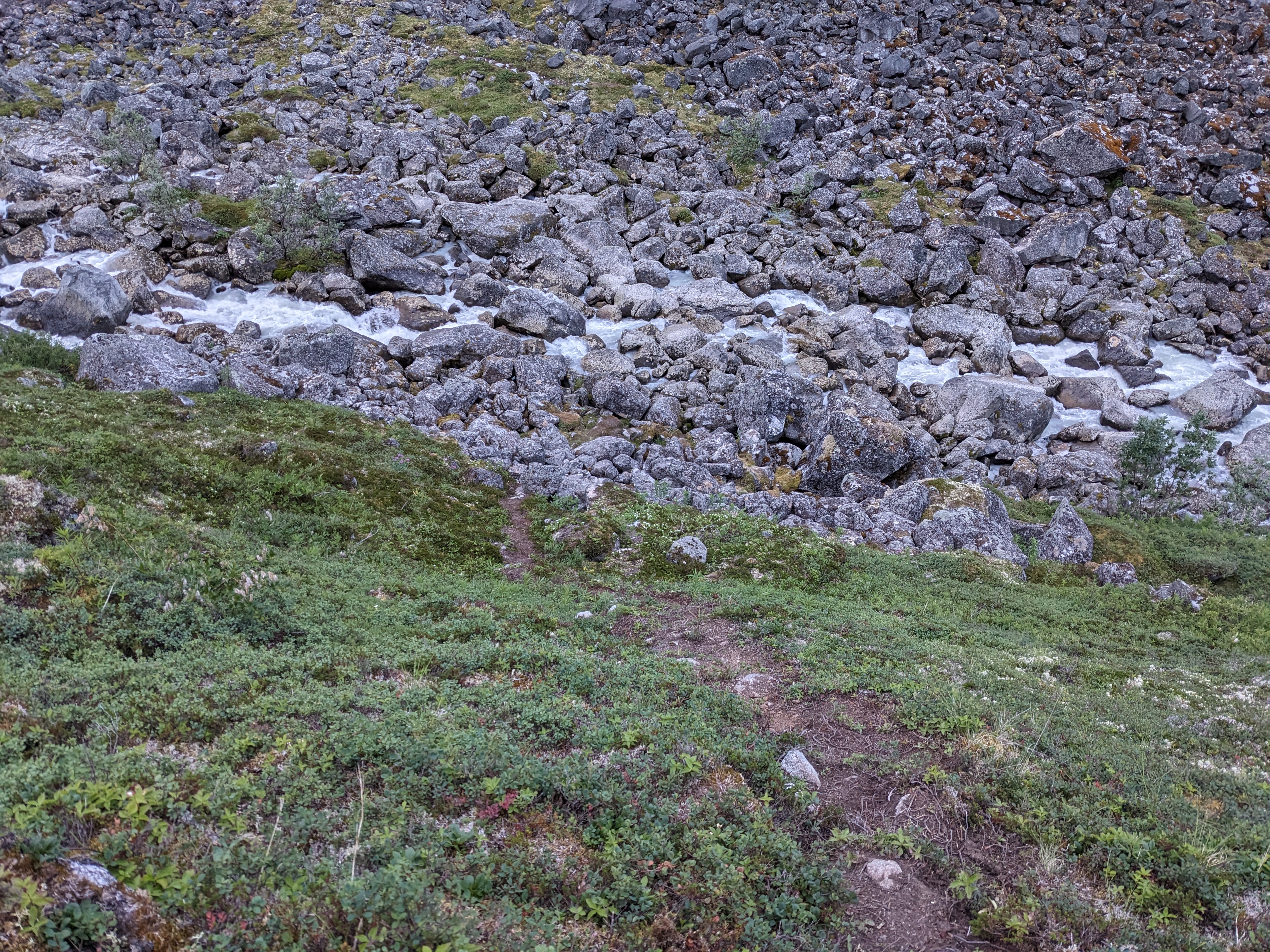 Eventually, the trail rolled over a verdant divide and a stream picked up. I love these little changes where one moment, all the rivulets and streams flow in one direction and then next they flow the other way. The trail here was clearly less used, though maintenance was still good. I tried a little jogging as it was all downhill. My map noted a large waterfall on the descent but from the trail but it wasn’t easily visible. Just before camp, I crossed a river which sported some small falls and enough variety in its rocky banks to be quite interesting.