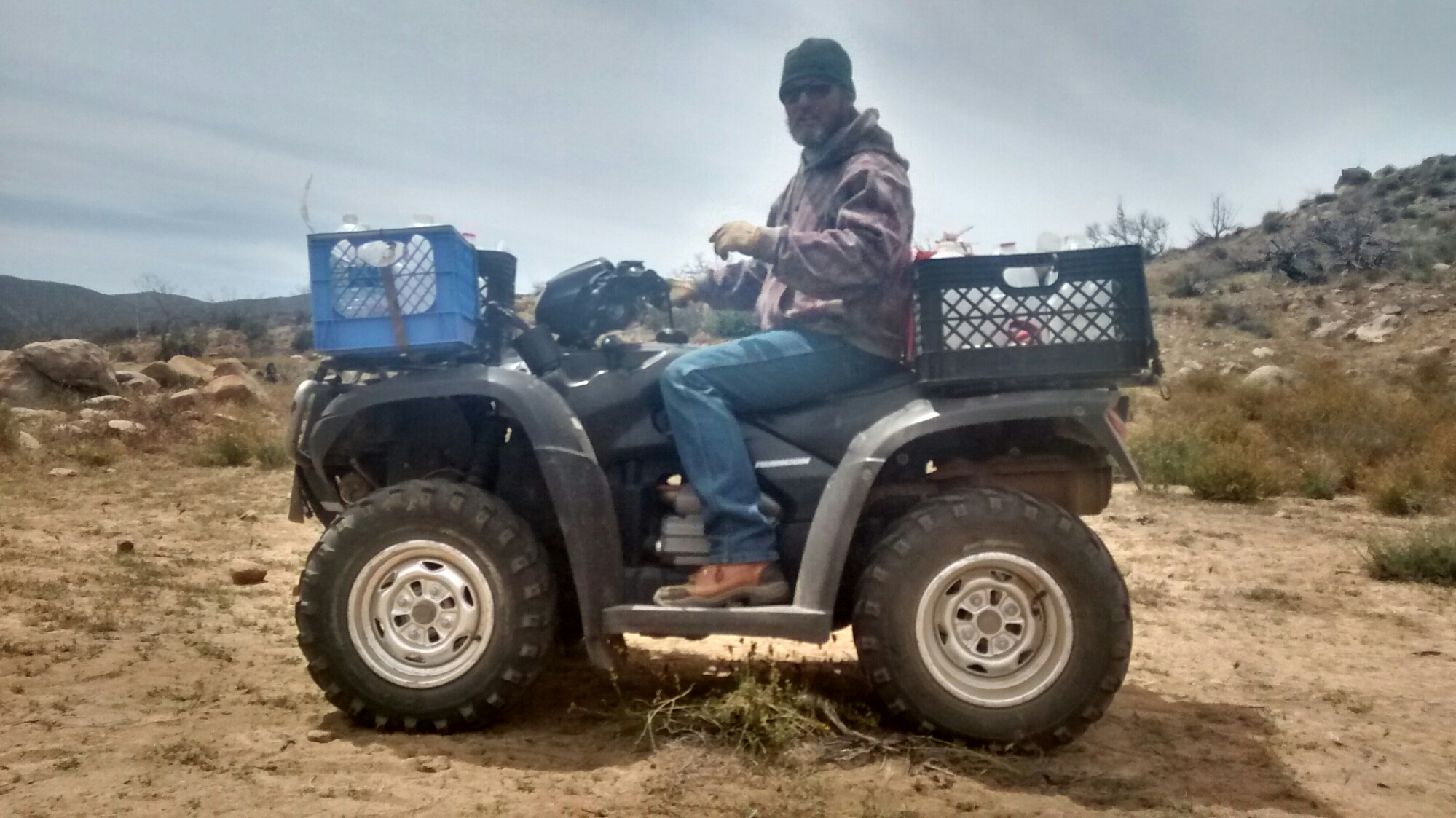 While I was waiting and eating lunch, Tom Firth drove by on his ATV to refill the water jugs. He’s a retired electric lineman who now works with the Backcountry Horsemen and has been refilling the Tule Spring water cache twice a day. Recently, an expert was called in who discovered that the spring itself has gone dry as have many other springs in the area. The springs are fed from underground rivers fed by the Sierra snowpack which even in this El Niño year isn’t at 100% of historical average everywhere.