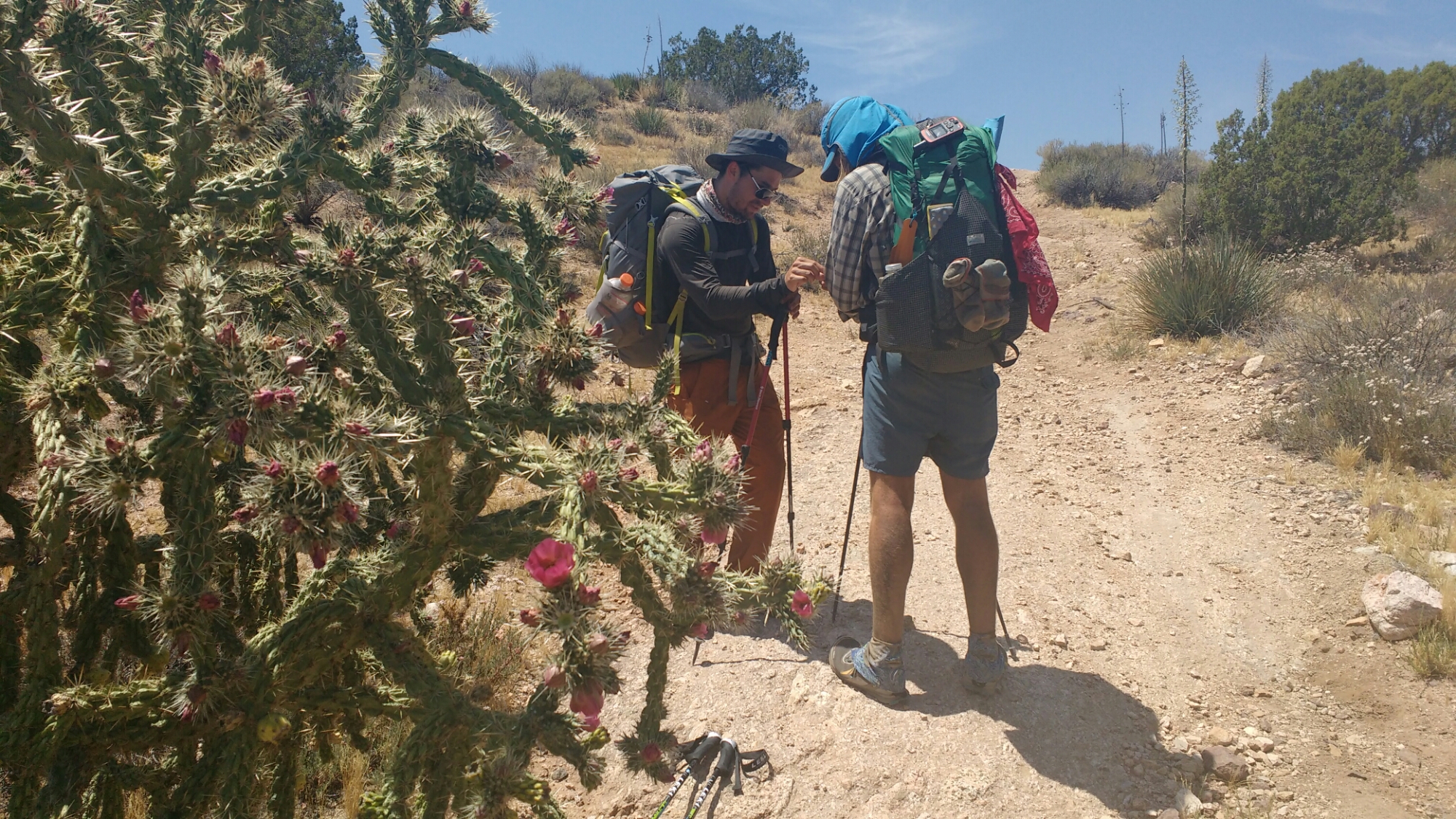 Just before the outskirts of Agua Dulce, Terminator tried to brush a cactus out of the way like a normal bush. Fruit Cup and I help pick the spines out of his arm.