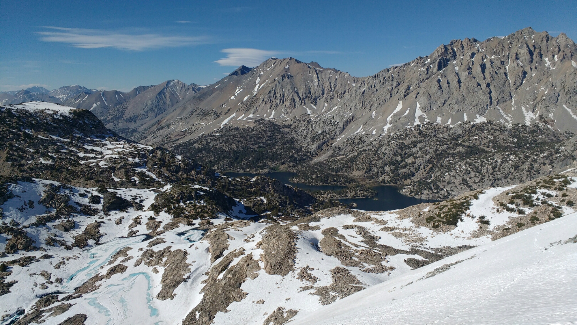 Since there was no trail, Cashmere and I had planned generally to, “traverse far enough that we don’t slide into that lake then start a glissade before the edge to the other lake but still wind up on the east side of those rocks”.