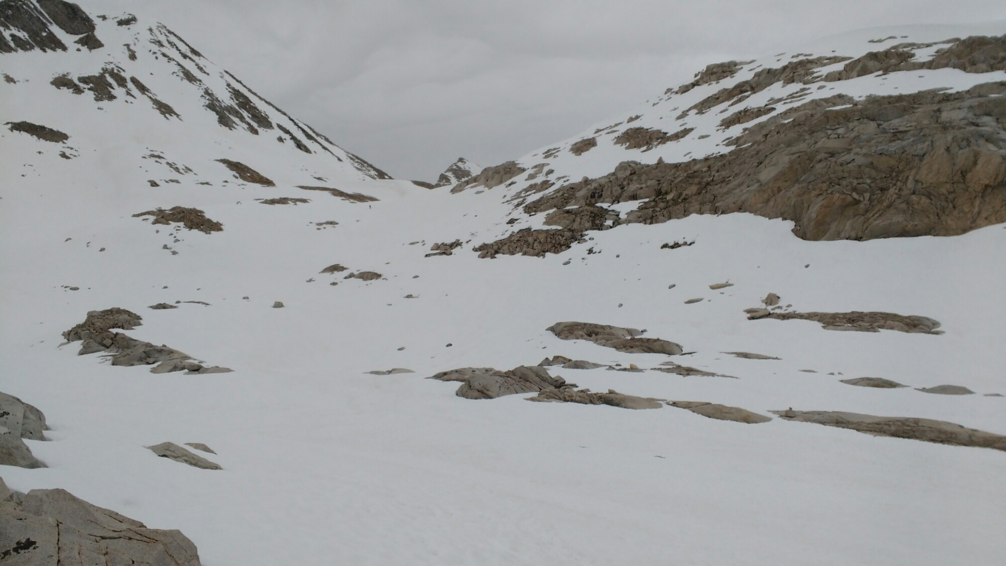 Muir Pass is just to the right of the little point in the middle of the saddle. Just after taking this picture two snowflakes decided to ominously fly by.