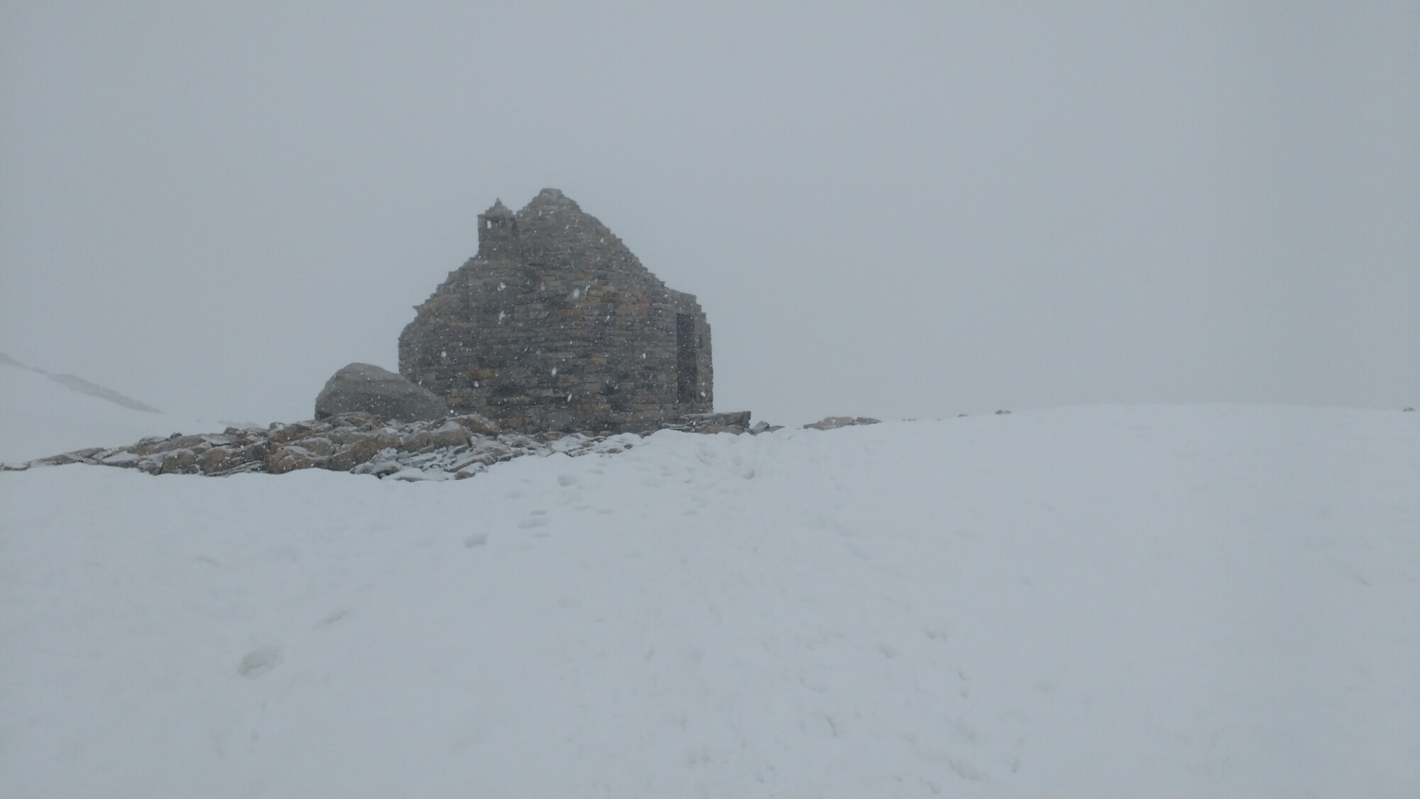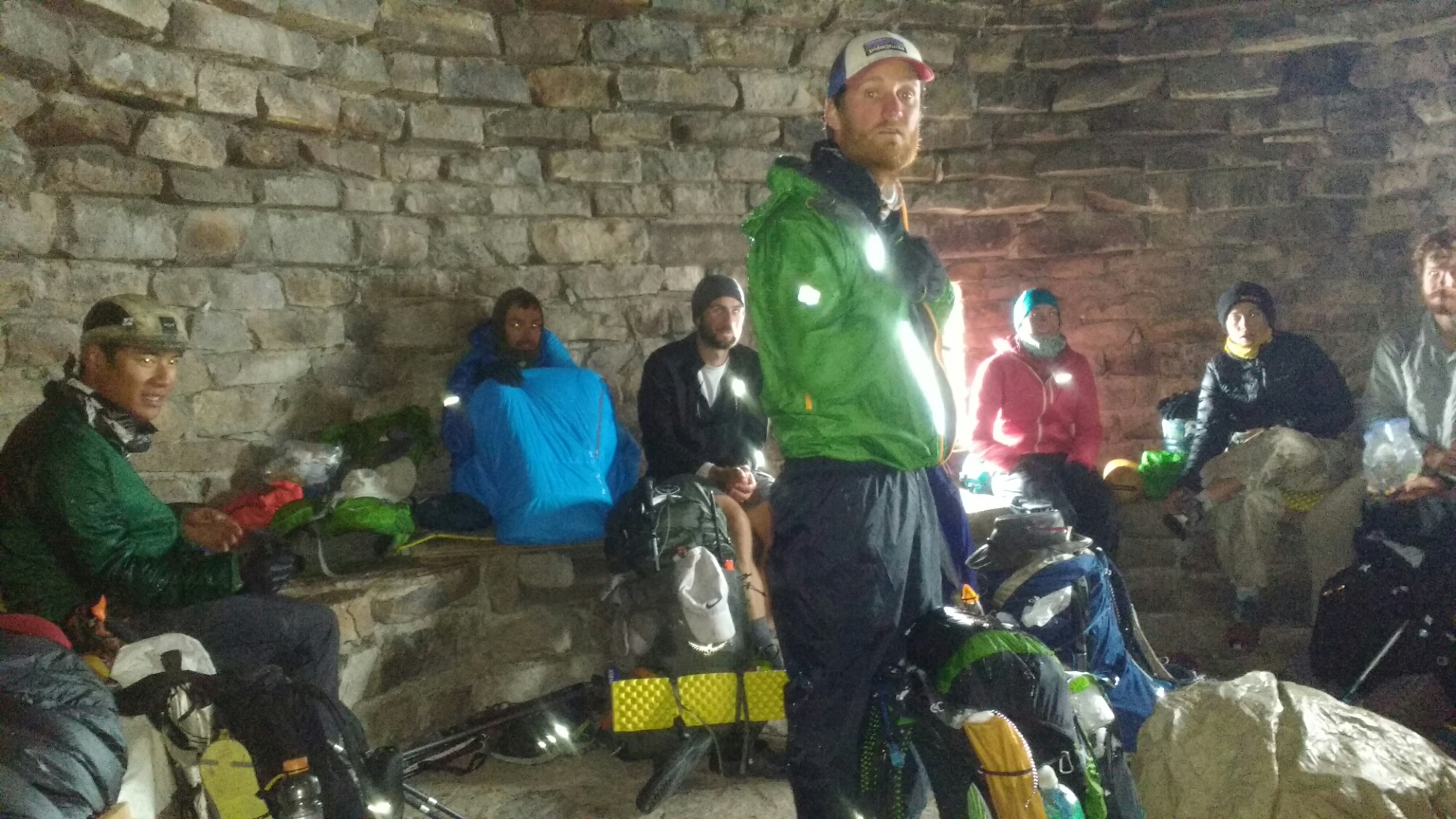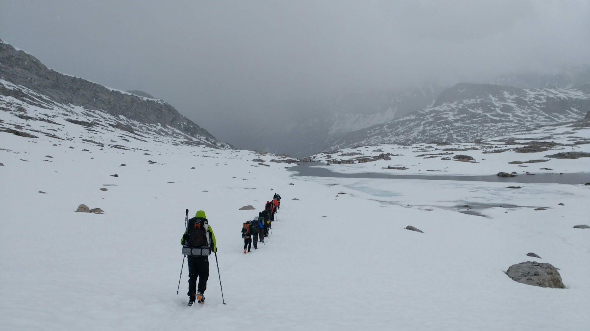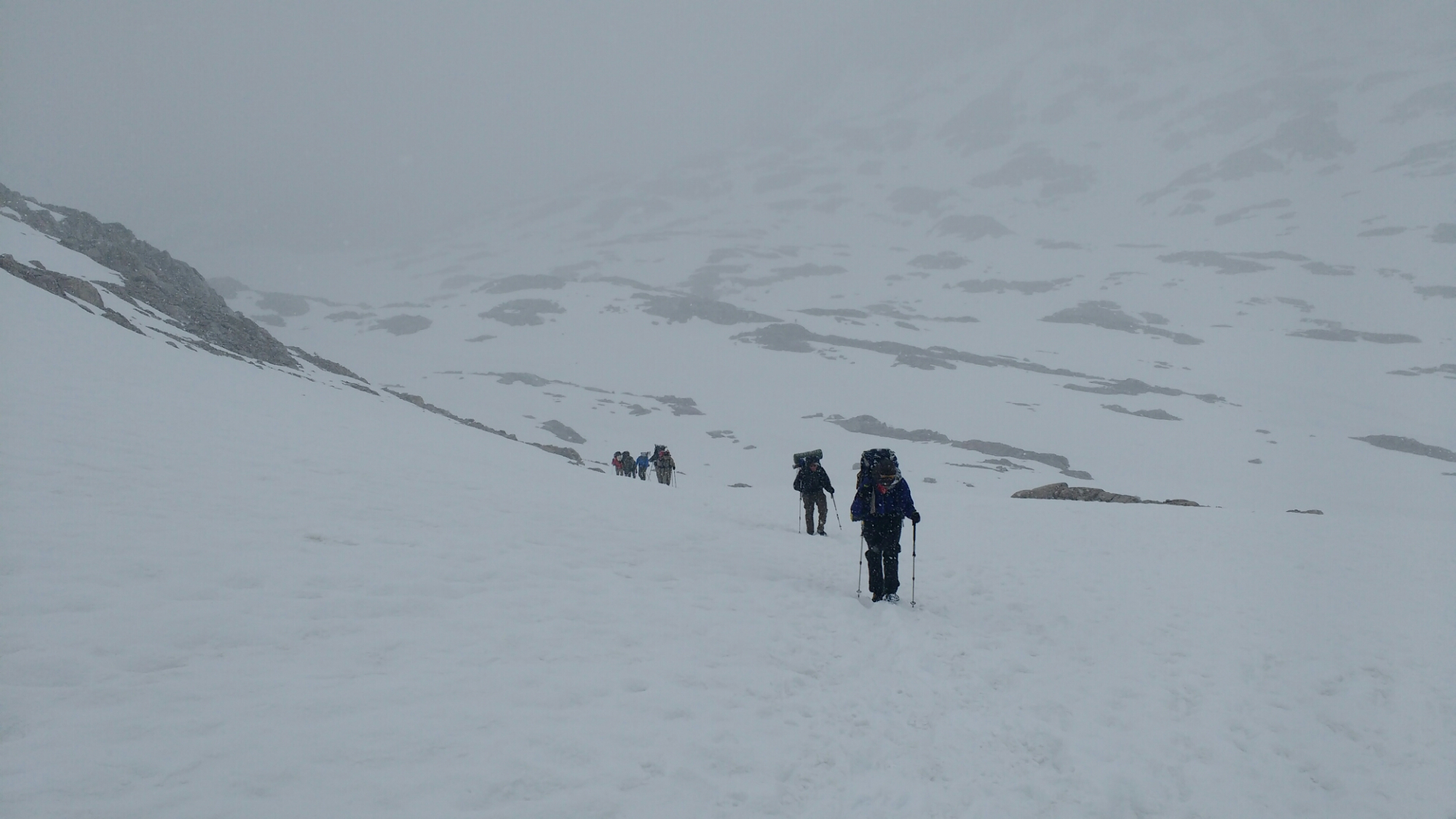 The rest of my group had left at 5:30am or 6:00am and so had about an hour of hiking in the snowstorm. I left the shelter and stood at the top of the last slope up to the pass. I was able to see everyone for about the last 3/4 of a mile of their approach when they weren’t behind outcroppings of rocks. Camille later said that seeing someone up there was a confidence lending confirmation that they were on the right route which made me glad.