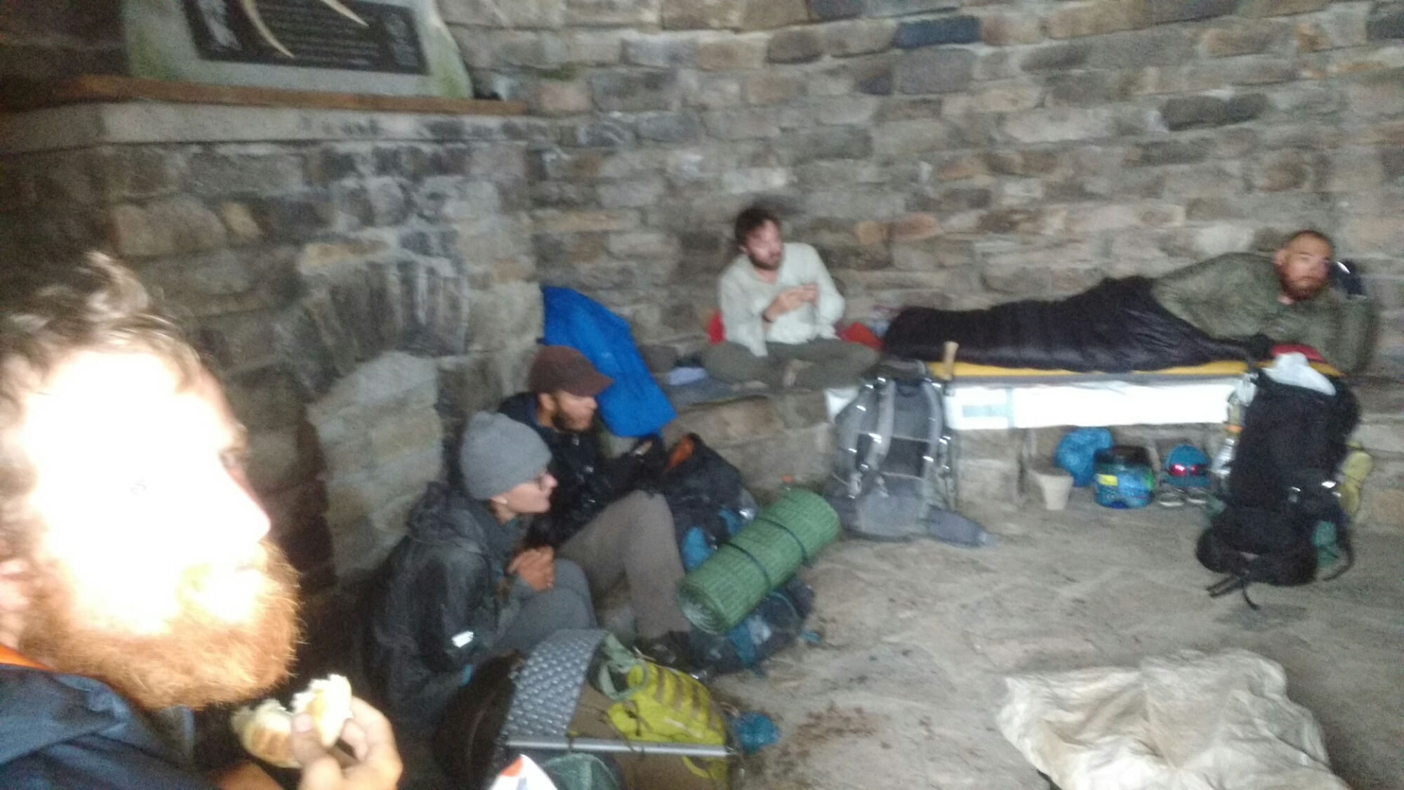 We waited in the shelter eating and playing word games in until the snow stopped. We weren’t fooled the first time it stopped. There was an interesting conversation to decide the latest time we were willing to leave the shelter given that we didn’t want get stuck in the dark, post holing through fresh, tackless snow. Drops of water started forming of the stones if the shelter’s roof and falling on us and our gear. It was still preferable to the storm.