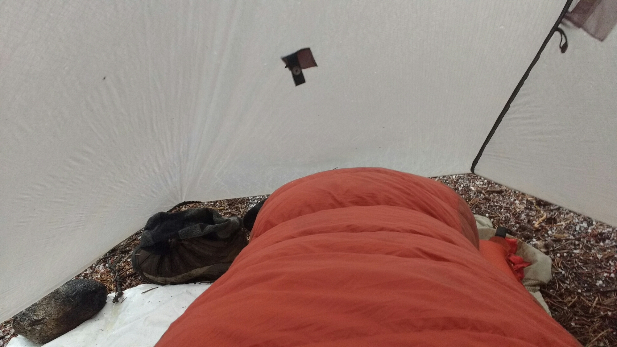 Due to the weather, there wasn’t much group socialization which required us to be outside. I could hear the sounds of some of the others talking through closed tent flaps. At some point it started to hail (see the ground visible around my poncho-tent). My poncho-tent held up just fine.