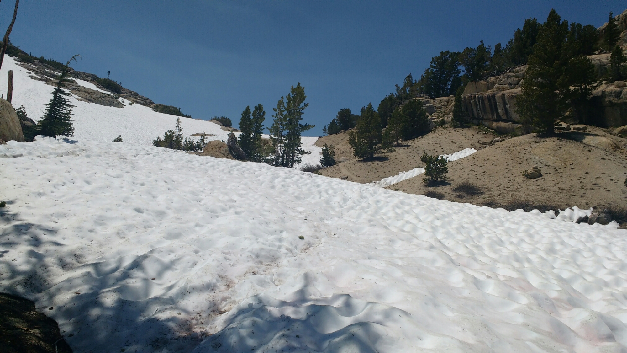The next climb had significant snow patches and you could see where people much earlier in the season had diverged wildly from the trail. Twice, while looking around to see where to go next, I saw hikers sitting or laying down. I like to think of these as autonomous, mobile cairns. The top of the hill was a lot like a minor pass.