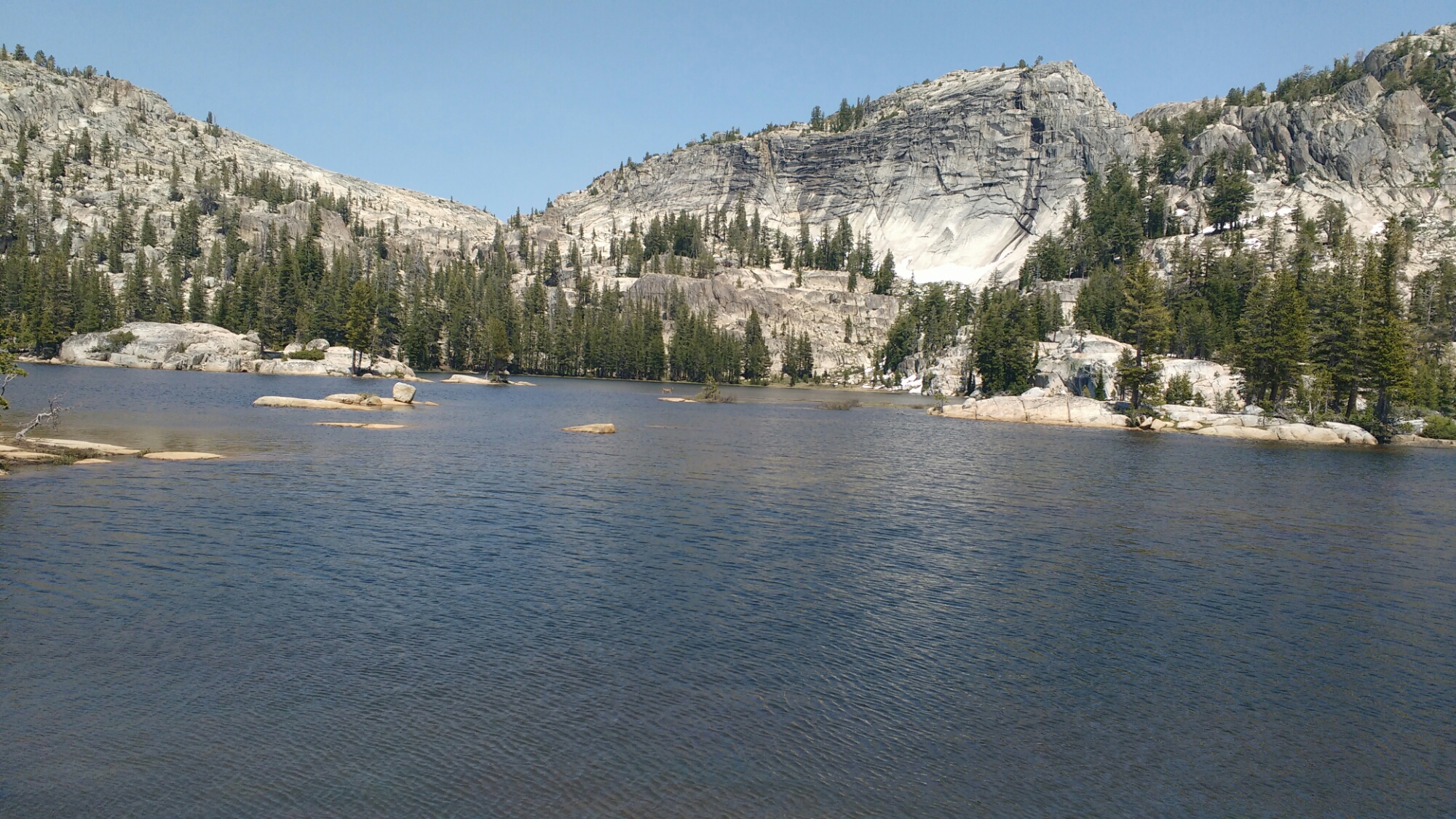 At Smedberg Lake, I met a group of hikers, about half of whole I’d met previously in passing. I joined them for a break and to let gear dry from the morning’s condensation. We saw a deer walk through the middle of the lake (sorry, this was a particularly hasty picture) so I went wading to see what slightly submerged walkways I could find and was able to get to a number of the rocks you see in the lake. I was finally bested by and underwater log crossing attempting to get the largest island.