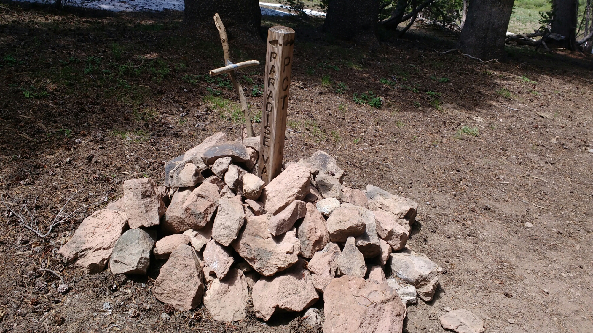 At the Paradise Valley trail junction there was a memorial to faithful hiking stick. The inscription reads, “1034 miles. Was good stick.” Given that I’ve had to replace my trekking poles and that both of their tips have broken in the last 300 miles, 1034 miles is pretty good for piece of wood that someone probably found by the side of the trail.