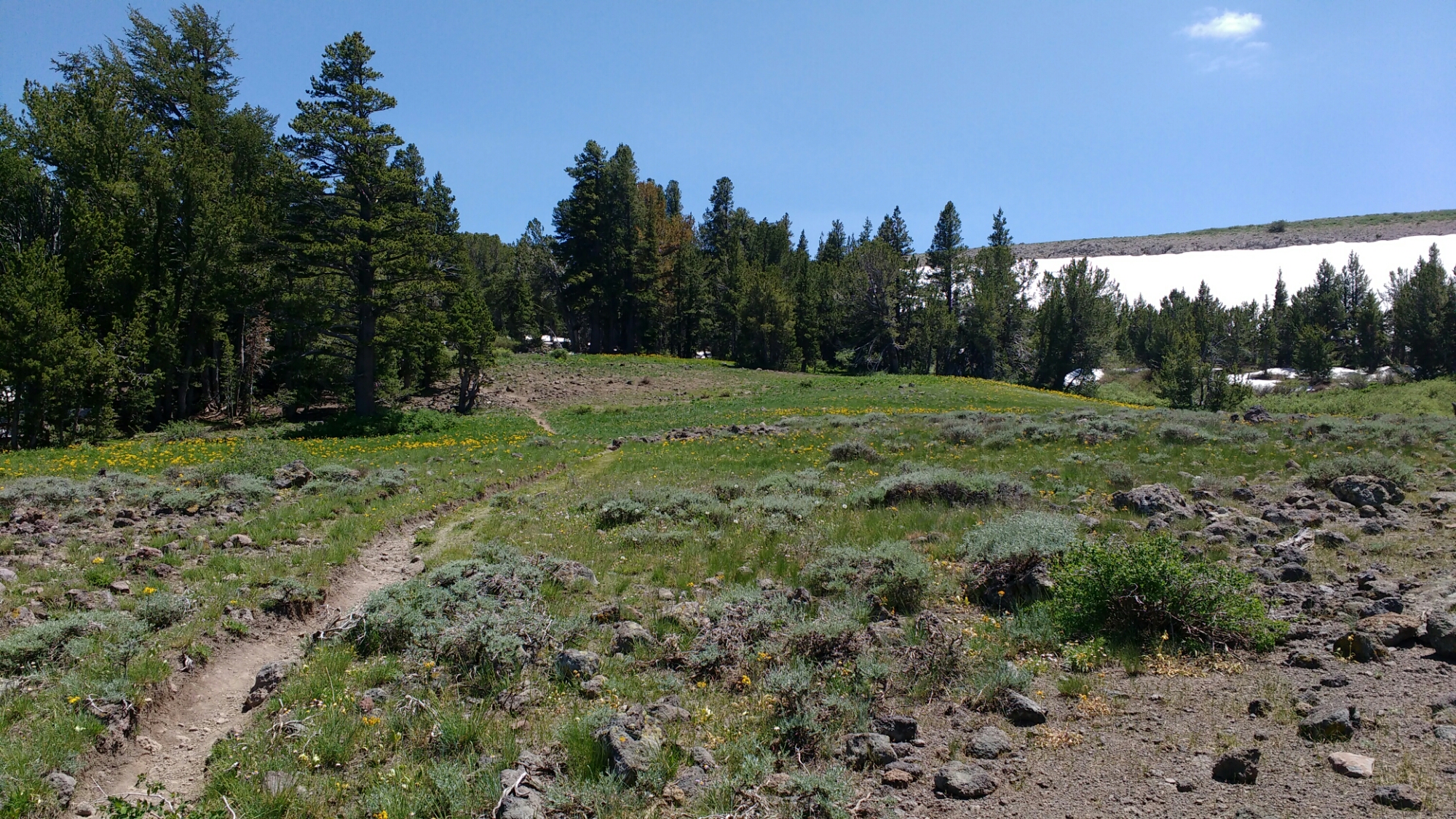 The trail was mostly a gradual downhill passing intermittently through grassy open spaces with pleasant scenery.