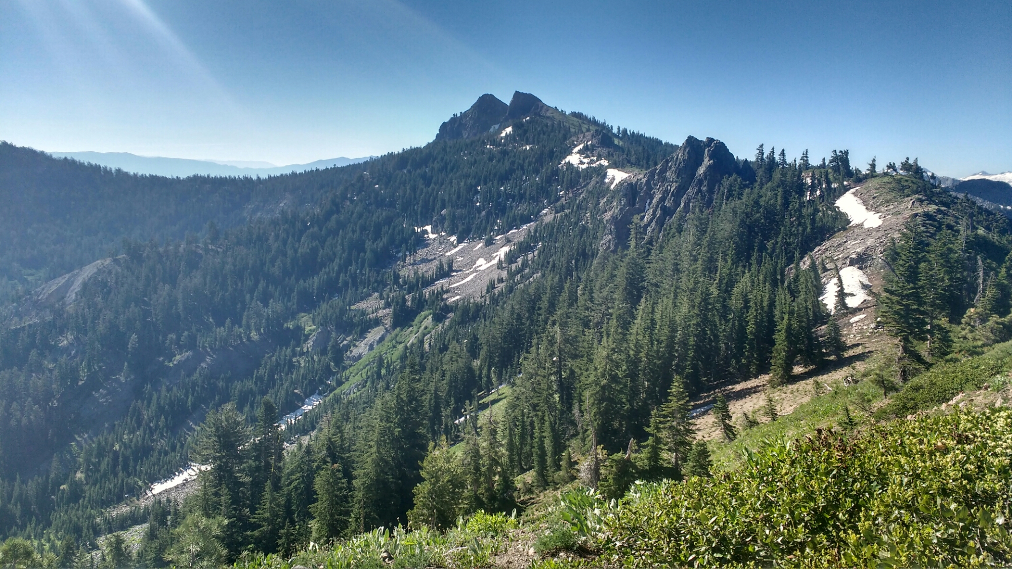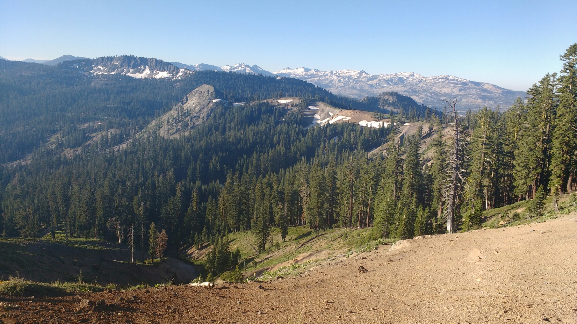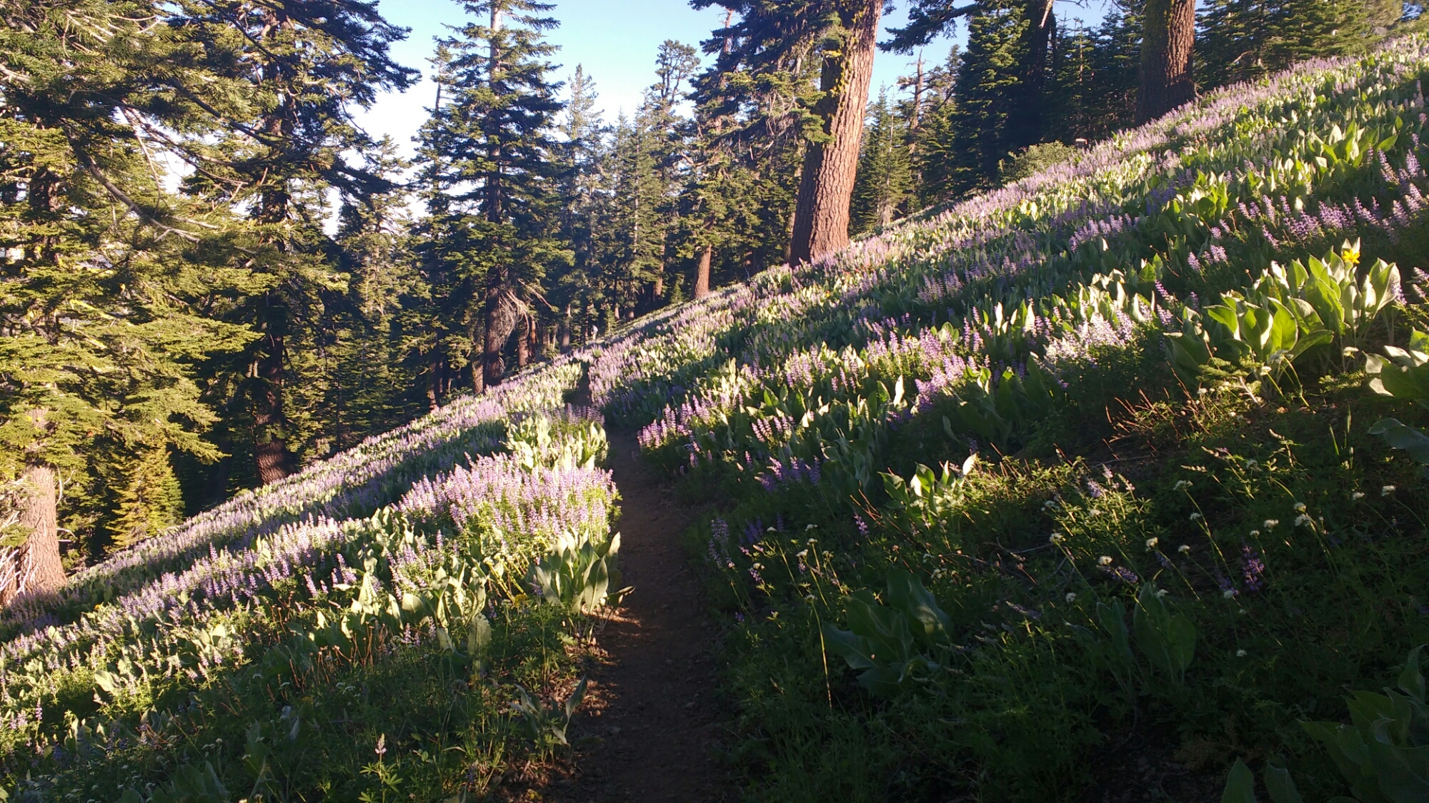 After yesterday’s long meander though copious quantities of generally uninteresting trees, I suspected that the trail was going to take a boring turn. Then I walked though the Granite Chief Wilderness. The trail there is largely a long traverse just under a ridge long which works its way between a number of high points. The views are very open and he hillsides covered with flowers.