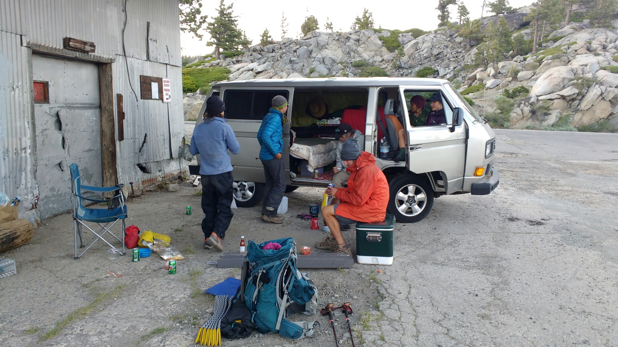 I’d been hiking on and off with Timo who has pain in his right leg, especially on downhills. His mother, a doctor, had told him to take five days of rest. He replied that he’d take a hiker rest if only 20 miles per day. We were past that and he was looking for the first campsite with water when… Trail Magic at highway 40! So after dinner with other hikertrash around a live-in van, we camped in the parking lot. Super classy.