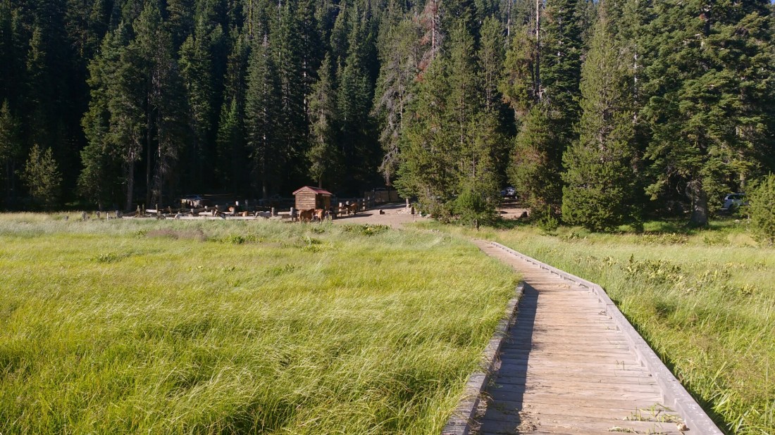 Drakesbad itself was very pleasant. I got I shortly before dinner which was hamburgers. I got a shower, did laundry, and got my resupply box. My uneaten which was plentiful and of good quality went into the hiker box. Night had fallen before I walked down the road to to the Warner Valley campground and stumbled upon Little Red Riding Hood, Short Shorts, and Scrapbook who I’d left when hitching out of town after breakfast.