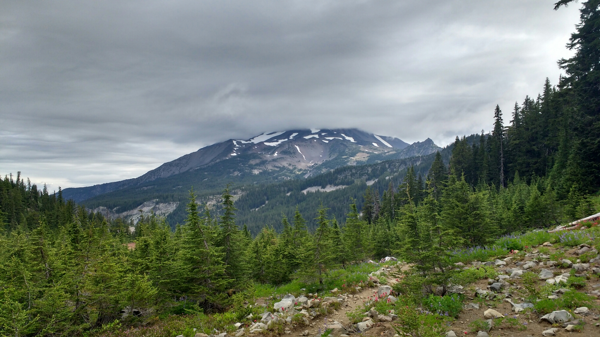 Today was largely mist shrouded making everything more wondrous. Unfortunately, there were several spells of light rain as well. Despite the lack of direct sun, hiking produces enough warmth to dry any clothes on the body except socks so if it hadn’t been for the later drizzle, I would have been quite comfortable upon arriving at camp. As it turns out, I was comfortable anyways since my destination for the day was Olallie Lake Resort whose owner lets passers-by to sit by the stove in the store of her off the grid resort.