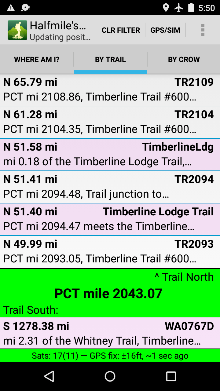 Here’s a screenshot of the app I use to track waypoints on the trail. It’s 5:50am and the app is filtered to show that Timberline Lodge is 51.58 miles from where I started near Olallie Lake.