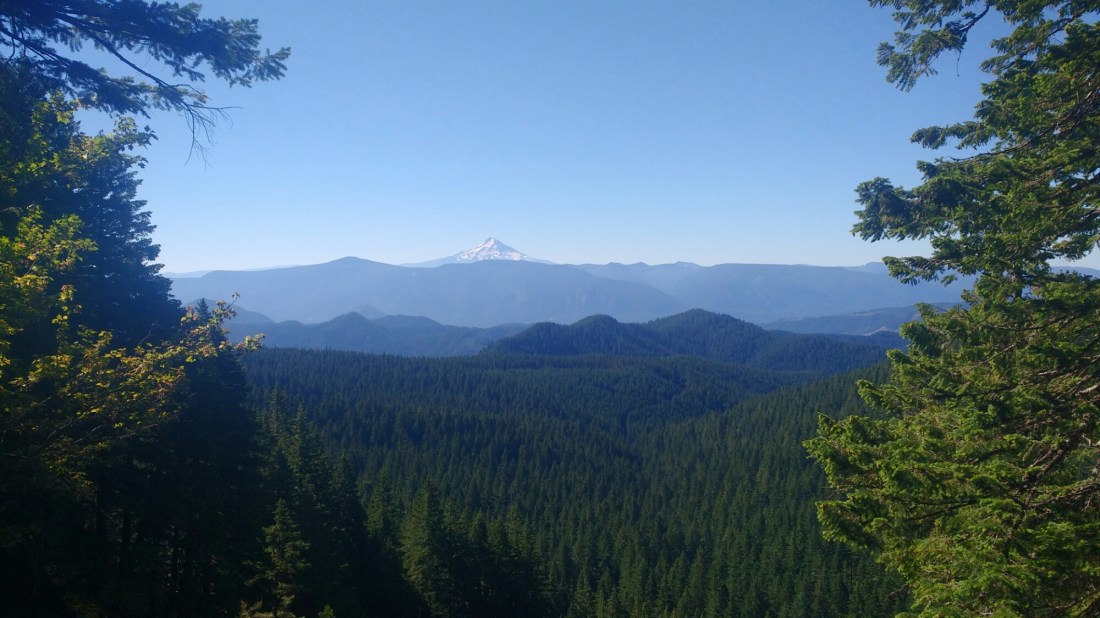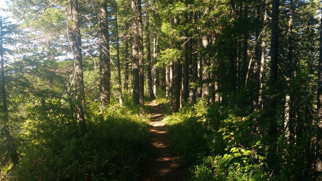 Today the trail was mostly tree covered but had a number of peek-a-boo views of Hood, Adams, and St Helens.