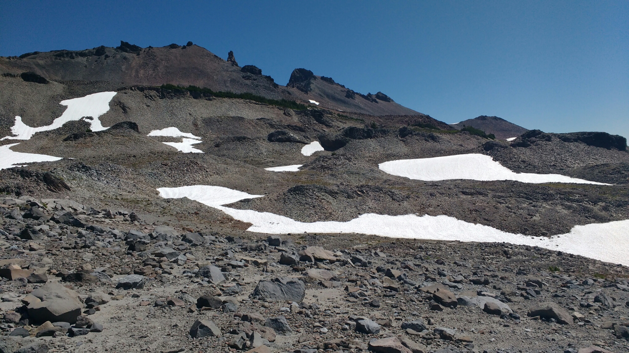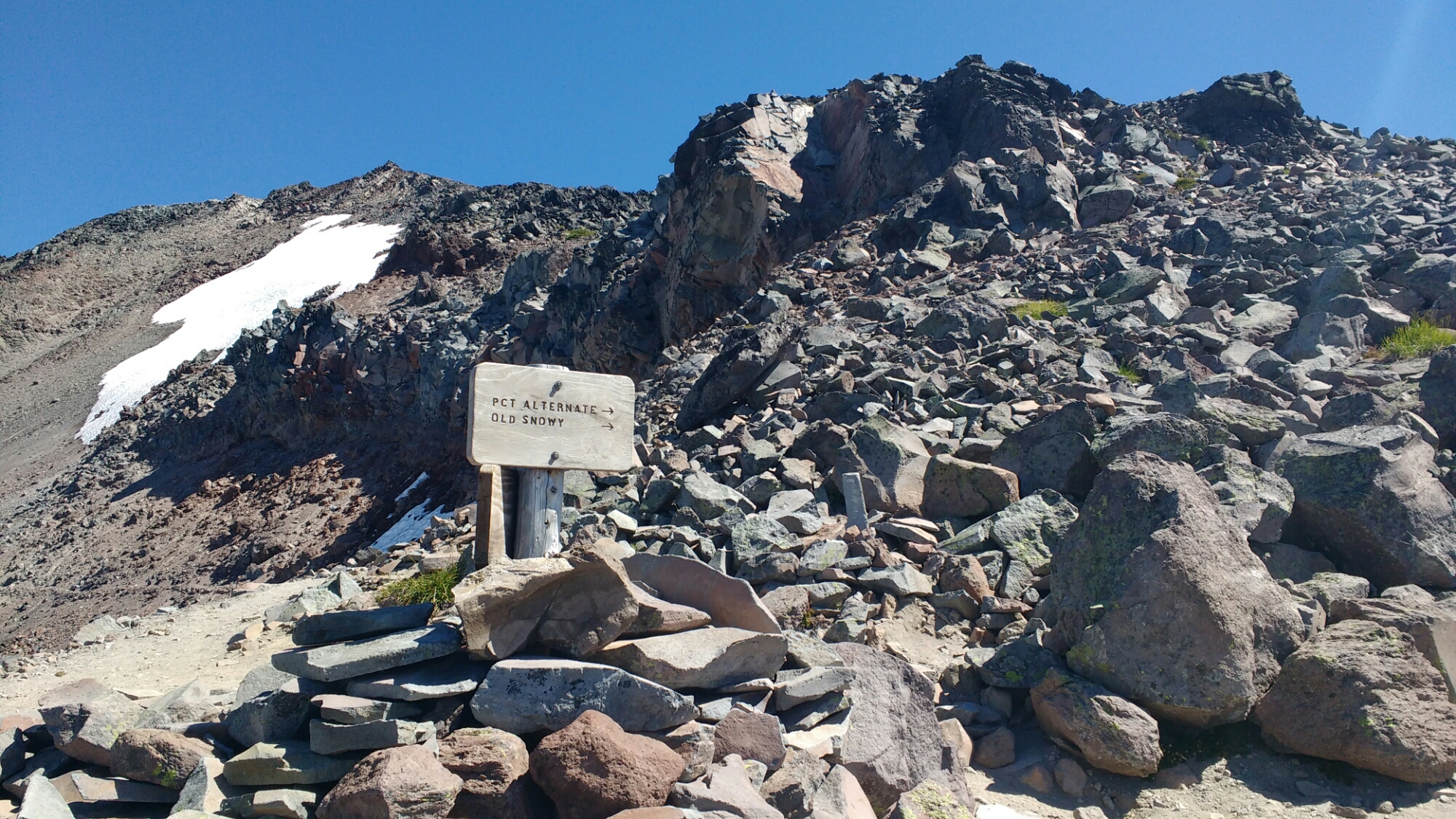 Skipping ahead a bunch of pictures, I took the Old Snowy alternate route which bypasses a couple of steep snowfields. It’s just a little longer but offers a view which includes aspects of most of the rest of the day. If I just showed you the pictures which I took before this, they might seem redundant with the ones I took at the top. Experientially, they weren’t. Each was like an act in a play and the Snowy Alternate (which had no snow and in fact is used to avoid snow on the PCT) like at the end when the entire cast comes out to take a bow.