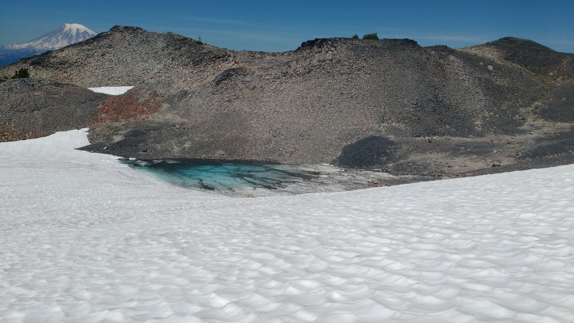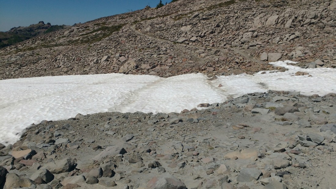 I remember a shot from a documentary about the PCT in which a hiker, in motion through falling snow under a grey sky, looks at the camera and says, “Washington stole my heart”. Since crossing the border, I’ve been anticipating something that would justify such a comment. Today I had such an experience. It’s too insignificant to say that I saw something which justified that comment. Twice I almost peed myself with the magnificent of the landscape through which I traveled. I felt like an addict, sober since the Sierras, amid blissful relapse. Panoramic pictures might help capture the view. Hiking is more than that in that the exertion and travel create a sense of participation in the landscape which other modes of travel don’t. This was not a picturesque moment, made uncomfortably hot by the comparative cool of a car’s air conditioned interior on a family road trip. Today’s emotion came from the depth of over 2,200 miles of trail walked one step at a time. The quality of the day can partially conveyed in that there was no one defining moment of which I have a flashbulb memory. Until now, Forester and Muir passes stood out like giants in my visual memory of the trail. Each has a small set if single pictures which, for me, completely capture the experience. Something about today required motion. Having something like four different, multicolored valleys each with treasures which only appeared at certain angles. Grand geographic features would appear or disappear around a corner, above a pass, or behind you and could only be seen over your shoulder. There was foreshadowing and climax like any good novel but the the denouement did not go quietly towards resolution but thrashed and fought for its own place in the story. You had to be there.