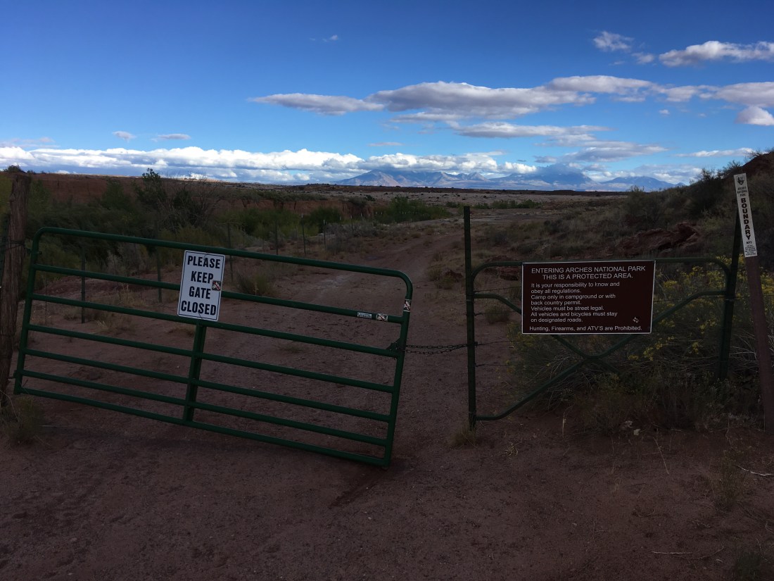 4) Because I don’t have an overnight permit for Arches NP, turn right instead of left (where the trail goes), climb out of the wash because you’re blocked by a hanging fence, and set up camp outside the second fence they have outside the wash.