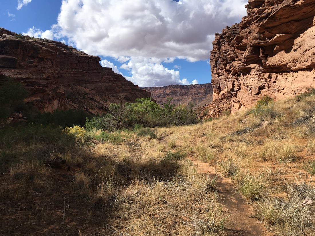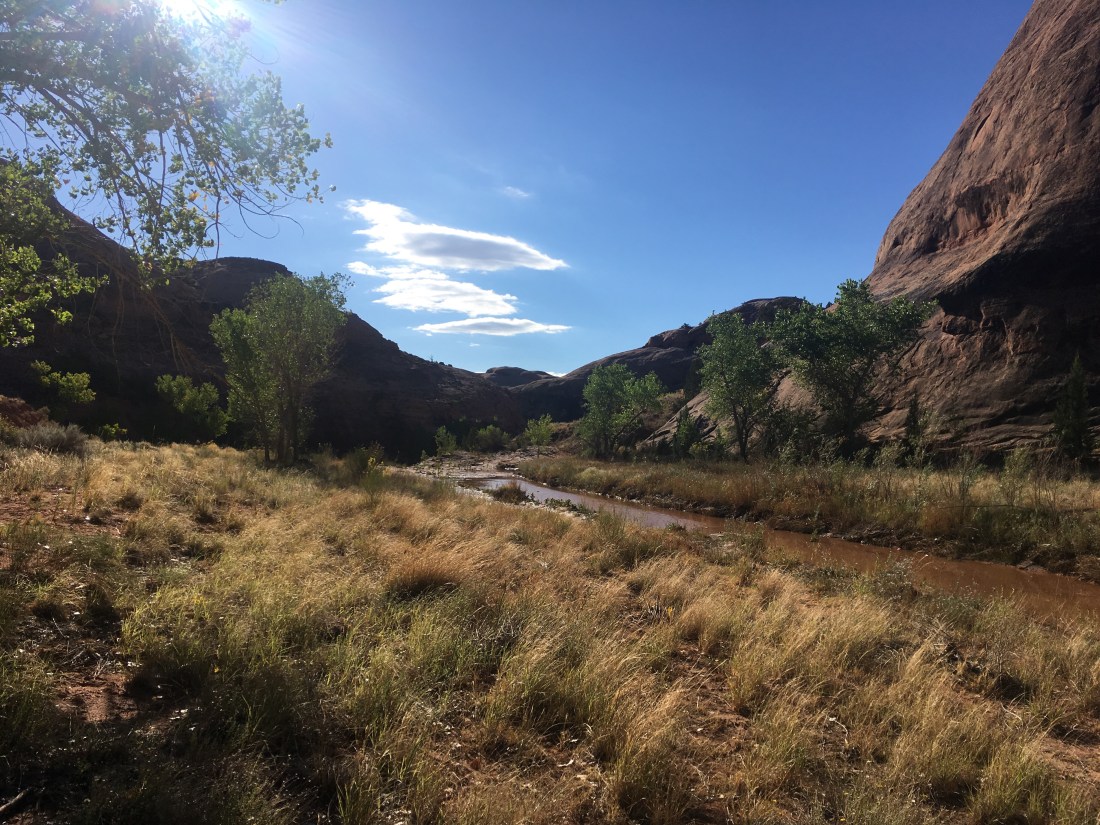 A brief road walk west and I was back in Courthouse Wash which has an intermittent trail. Unfortunately, the tail will try to kill you if you don’t outsmart it by crossing to the trail on the other side of the wash at the lowest point of the water. Otherwise, you get trapped against the canyon wall and try crossing neck deep stagnant water.