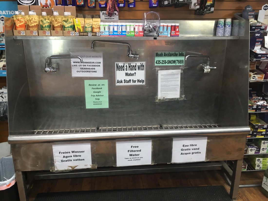 I made it to the road into Moab around 11am and walked into town. A peach seller recommended Gearheads as a place to replace my bent pole and the compass I lost, probably during the neck-September adventure. The place is a gem. Very helpful and will refill you water.