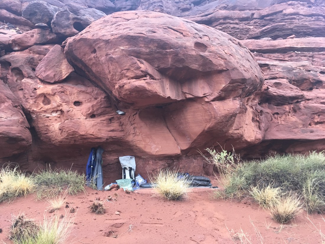 I found an overhang under which to camp for the night. No need to set up a tent. It’s on the high side so no worries about flash floods.