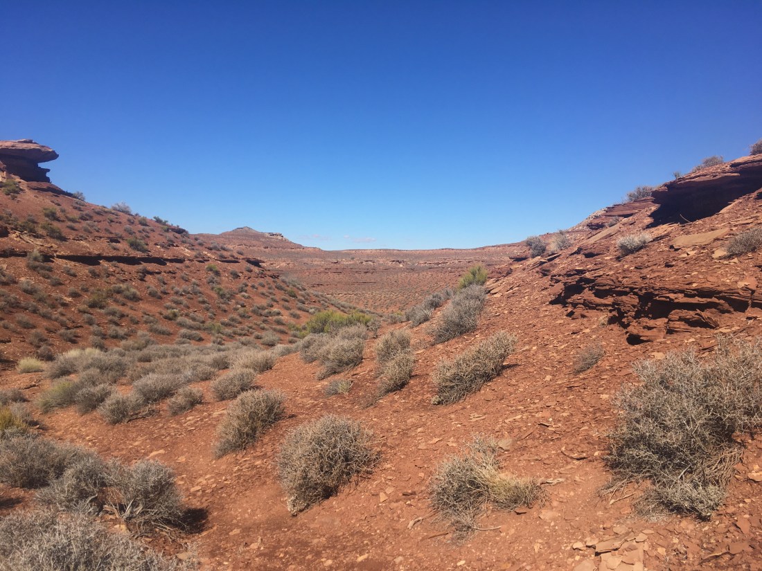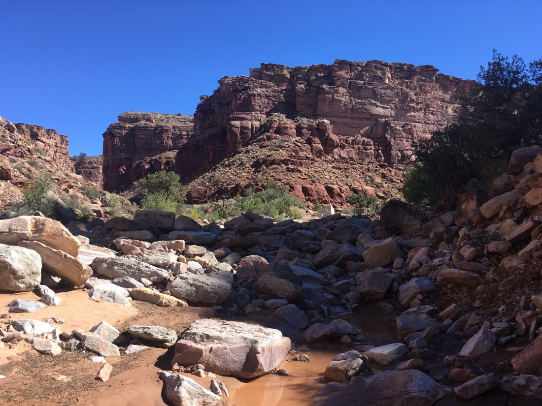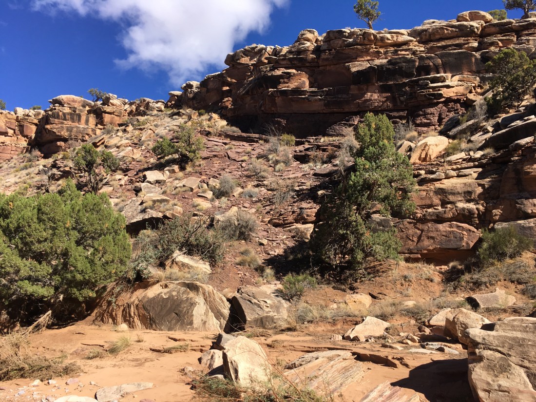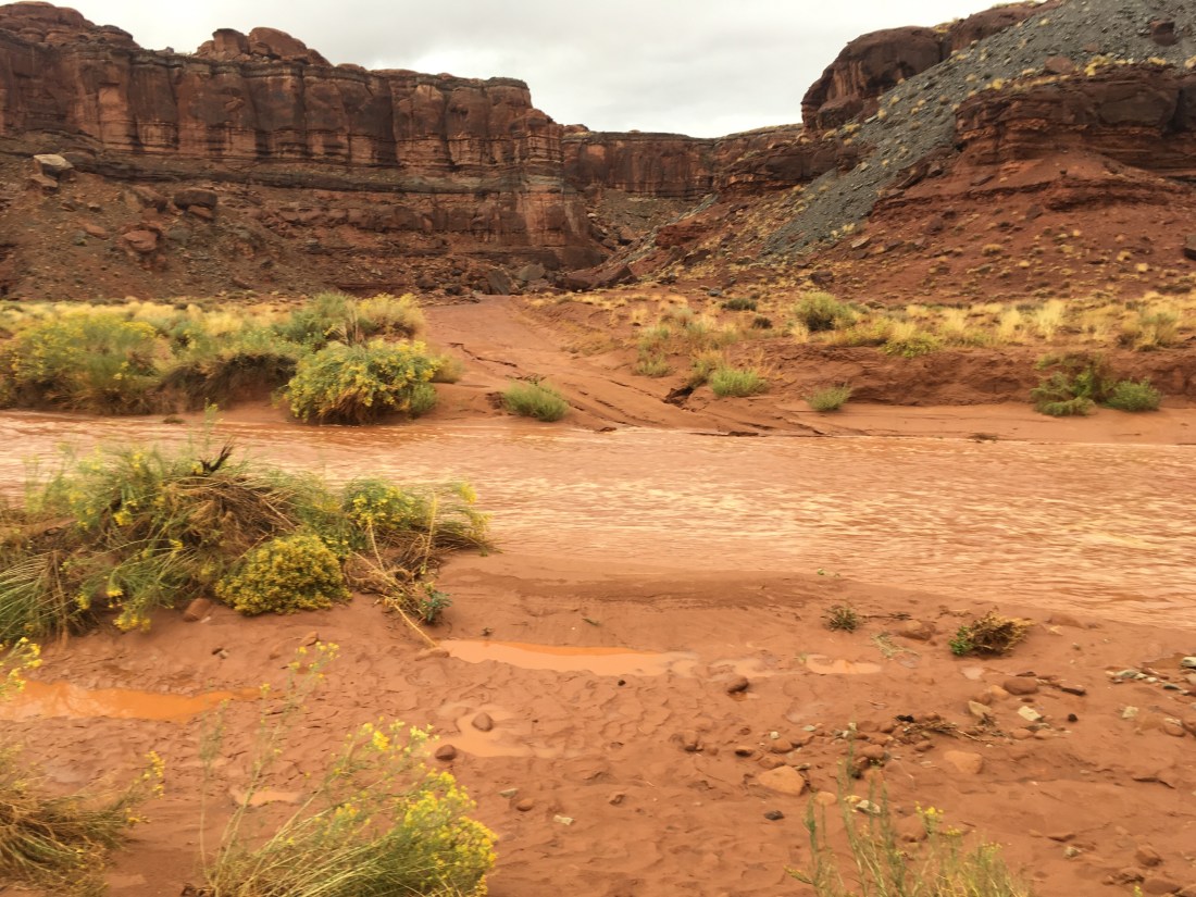 The big pour off was obvious as was the bench across which the route. What learned next was that “desert” means land of red waterfalls.