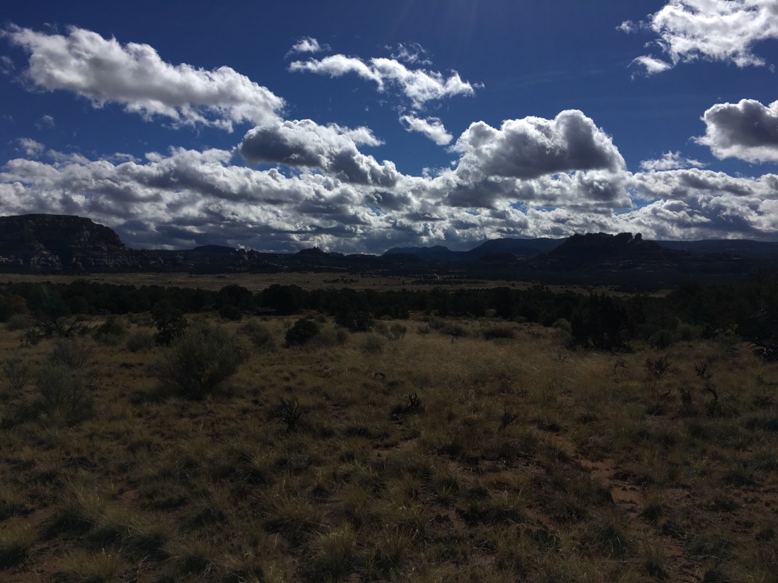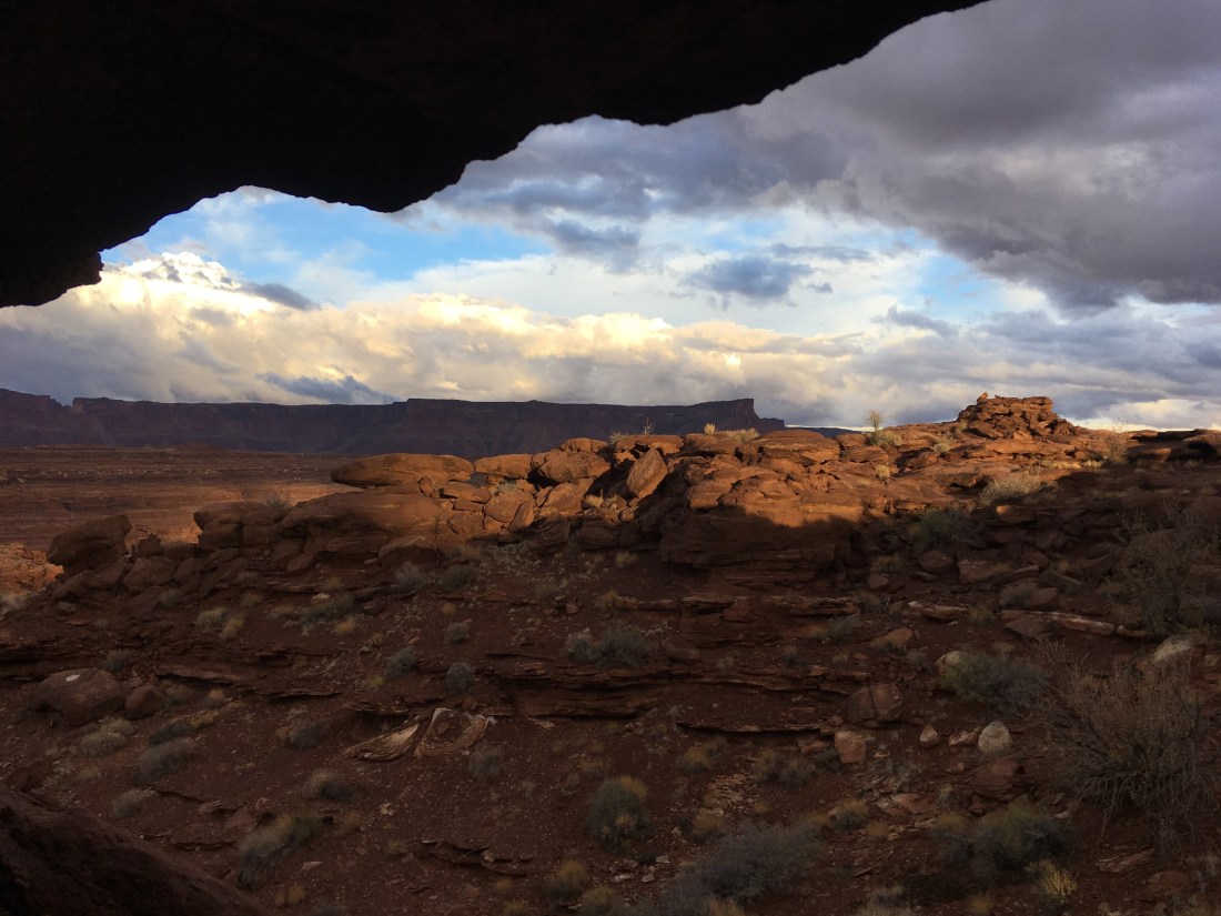 At this point I’m about as high as I can go and decided to find some place to camp since large dark clouds were blowing in to replace the playful white ones. At that point I realized that all the “dirt” (half-dry mud and gravel) on which I could pitch my tarp was too shallow for stakes. So after some desperate searching, I wound up in another alcove, this one not so nice as last night’s: thing and sloped to roll you out. Fortunately the clouds haven’t lived up to their potential. Hope that keeps up.