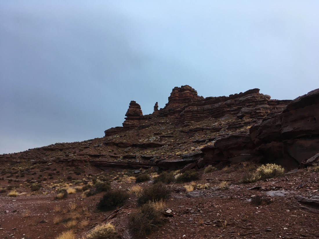 At the eastward turn where you exit Indian Canyon, I drew water and started trying to find my way up the series of ledges the guidebook mentioned. The way up would frequently be visible only once you were right under it. This was disconcerting because I couldn’t tell if I’d gotten high enough to start contouring which is the next step in the guidebook. I spent a great deal of time trying to figure out where thing were supposed to go but was worried about exploring because in the thin, sodden soil. I was leaving deep footprints and as I frequently use footprints as guides and confirmation, I didn’t want to leave a wrong step to confuse others.