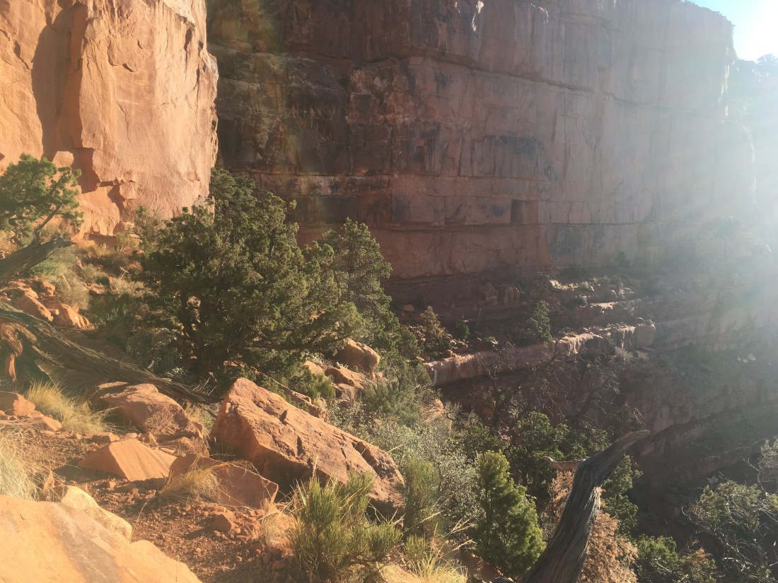 The Nankoweap trail itself somehow felt familiar somehow like hiking in the Cascades despite it clearly being very different. The level of trail maintenance wasn’t high but it was in pretty good condition. The start was a long traverse with views across many points and bluffs and ridges. The Colorado itself was out of sight the entire time save for a small glimpse before the last descent. Footing wasn’t generous but was reasonably firm when there was significant exposure. The NPS description mentioned descending cliffs using trees. In practice it’s just that the steps down are just a little too large so you have to sit on the rock above and lower yourself the last few inches with a tricep dip. Using the tree was unnecessary. There was also no exposure while doing this.