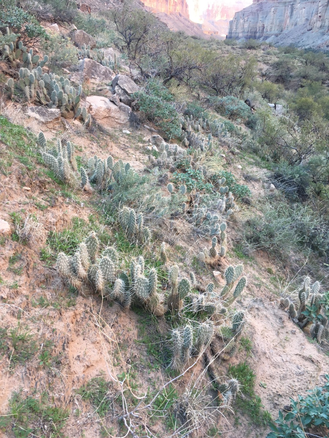Today was mostly spent hiking the Escalante Route to connect the Beamer and Tonto Trails. It started with a really beautiful climb up a hill with intensely green ground cover on red, sandy soil.
