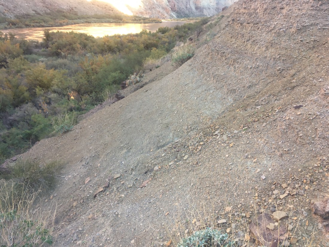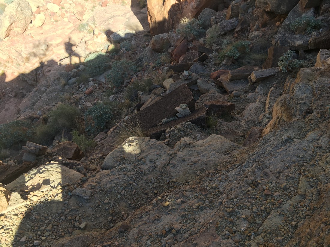 Things started by continuing the game of hide and seek with the use trail which headed south of Nankoweap. Per Skurka’s notes it does “fade” after Kwagunt Creek but it doesn’t really completely disappear except where the slope is just rocks.