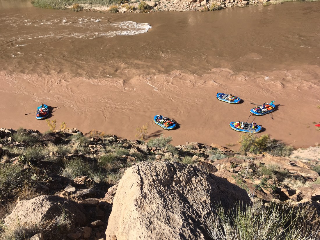 Then things went awry. I hadn’t researched the proper drop point for a hitch from the left bank of the Colorado to the left bank of the Colorado across the confluence with the Little Colorado. The NPS description of the Beamer Trail says you only have 1/4 of a mile after the confluence before the trail is inaccessible from the river due to cliffs. If we couldn’t find a eddy quickly enough, I’d be stuck as an unlisted member of the rafting crew. At the confluence, there’s a small sand island. The rafts tried to catch a difficult line to get above it which would get them near a clearly visible access trail. Two of the lighter rafts made it. I think my extra weight made it particularly hard for my paddler to flight the current enough to catch the smaller around to the far side of the island. The captain made a quick decision and we landed on the island without eddying out which impressed me as there was some timing involved among multiple people.