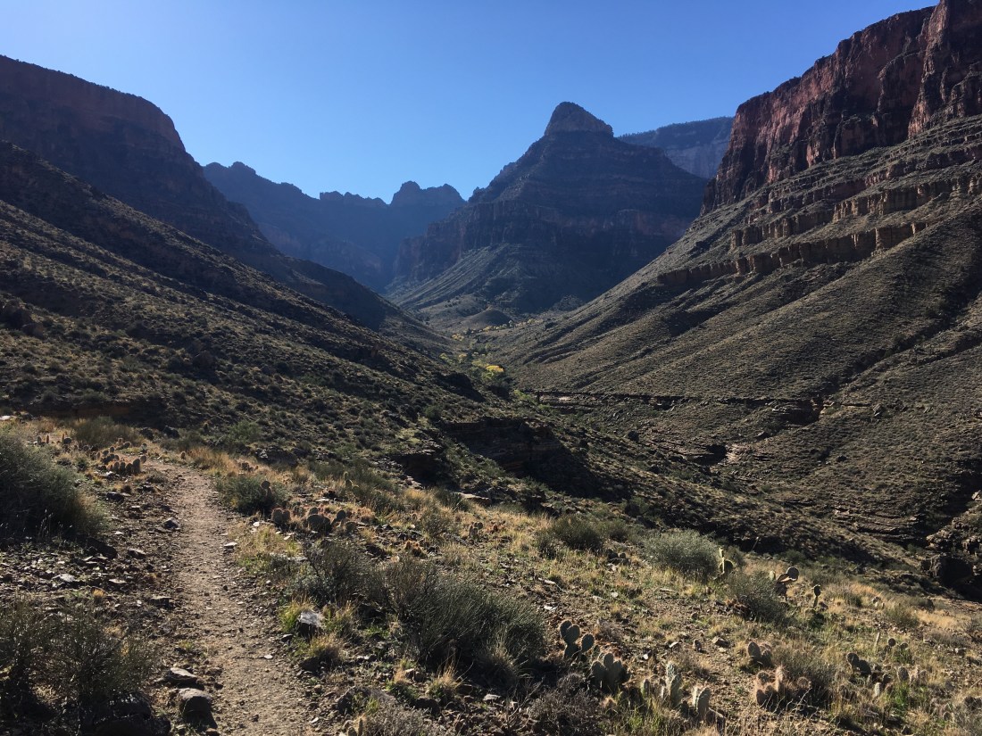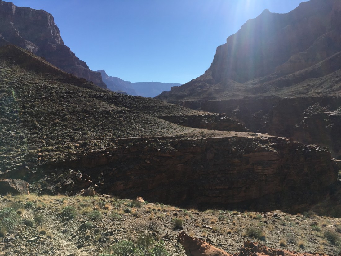 Strangely, one of the things which I think is most visually interesting is where the trail switchbacks tightly against an interesting backdrop. The trails I’ve been on so far in the Grand Canyon were faint enough that you’d rarely get more than a glimpse of them in the distance.
