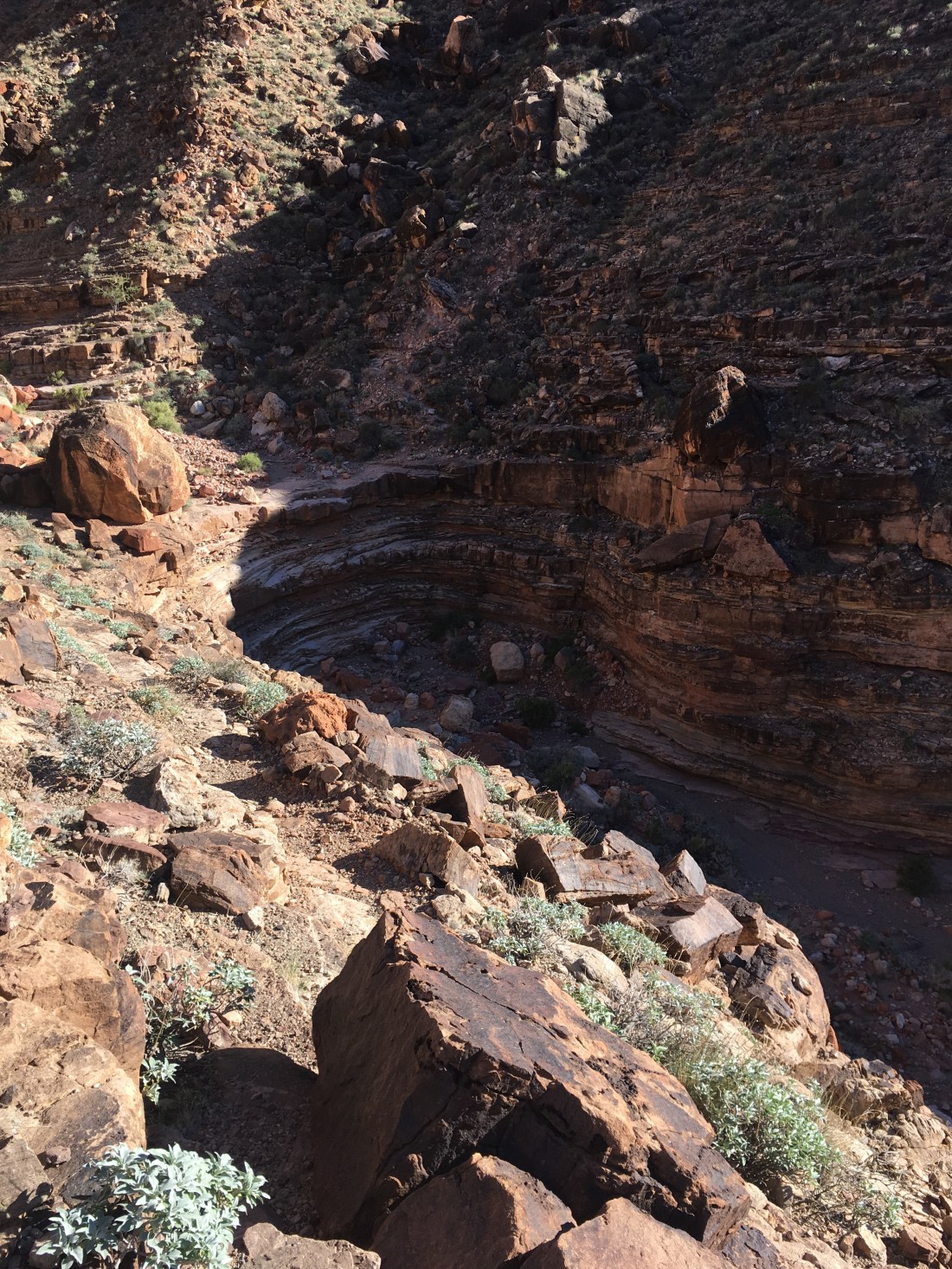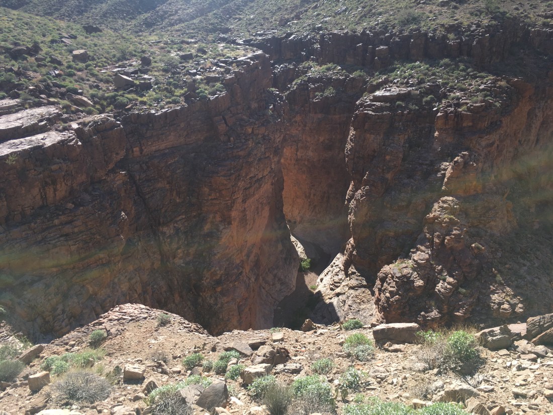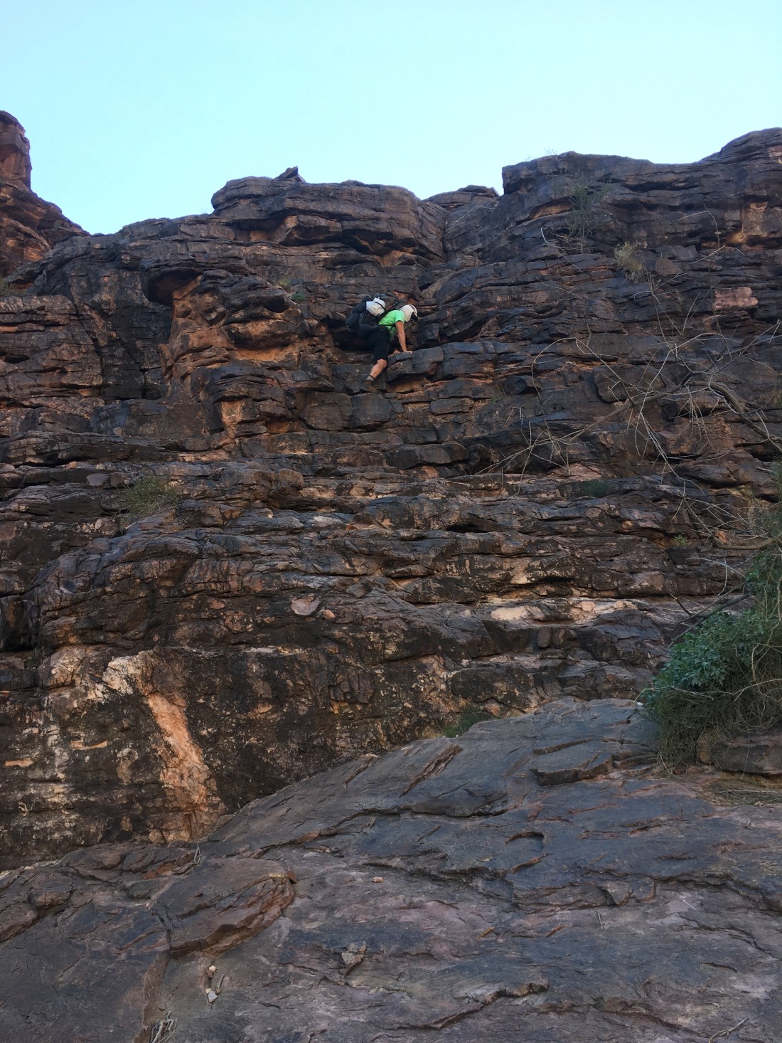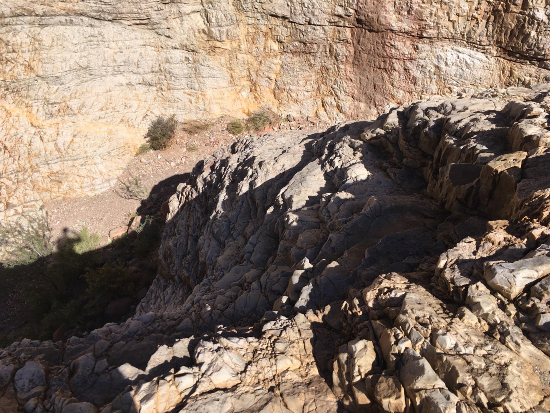 It was in these narrows that I met a 60+ year old who was out for a solo hike. It was about lunch and we got to talking and eventually decided to hike past Papagos together since there’s supposed to be some climbing and sketchy descending in that short stretch. The NPS description mentions a haul line for solo hikers and I’d rigged one preemptively this morning. My retired companion, however, didn’t have use for one and so being half his age with half the pack weight, neither did I. It’s good to have role models.