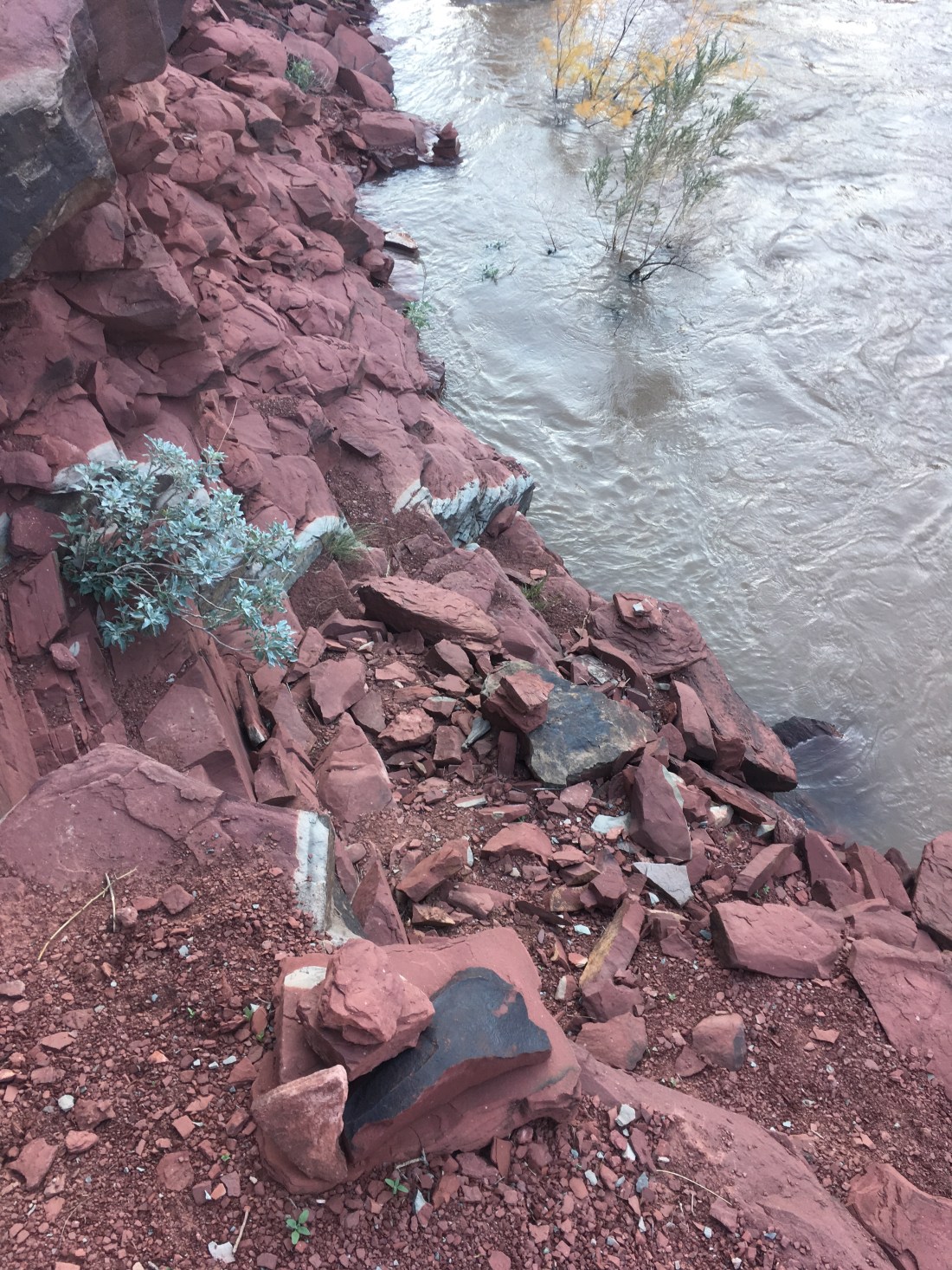 I got out and ran to the north side of the small island to see if one of the rafts or kayaks beached there could get me across. I had to wade out a bit so I could understand what they were yelling back but basically, the current was too fast around the top of the island to get me to the visible access trail. In my mind this was a huge problem because low cliffs which weren’t obviously scalable started immediately thereafter.