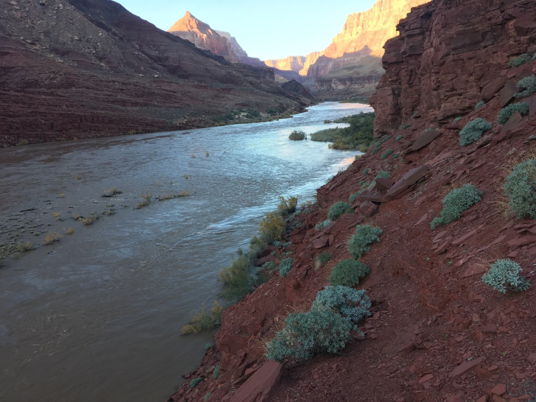 Today went swimmingly. It look less time to get to the Nankoweap trailhead than I thought, less time to get to the Colorado River, I made contact with a pleasant rafting party and made plans for tomorrow’s cross river hitch then made it part way to the hitch point.