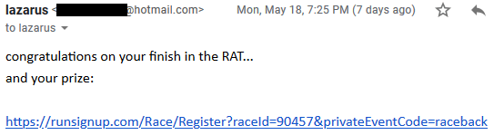 May 20, after I’d been convalescing in the glow of a multiple-day release of tension and endorphins, I get a follower request on Strava from a stranger. I accept and a few hours later, they let me know about a Facebook post from Laz asking if anyone knew why I’d stopped so close to the finish. Apparently this was a 1021.68 km race. Panic set in and few searches revealed this: