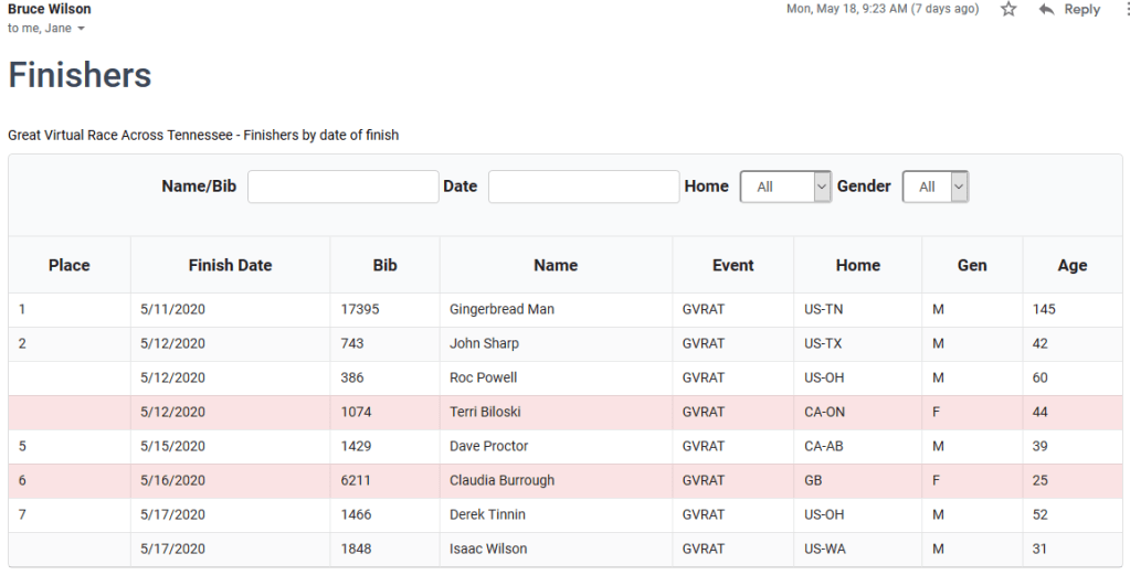 May 18, the day after I’d logged my 1000th kilometer of the 1000km Great Virtual Race across Tennessee, Dad sent me an e-mail with a copy of the finisher page showing my name tied for a 7th place finish on May 17th.